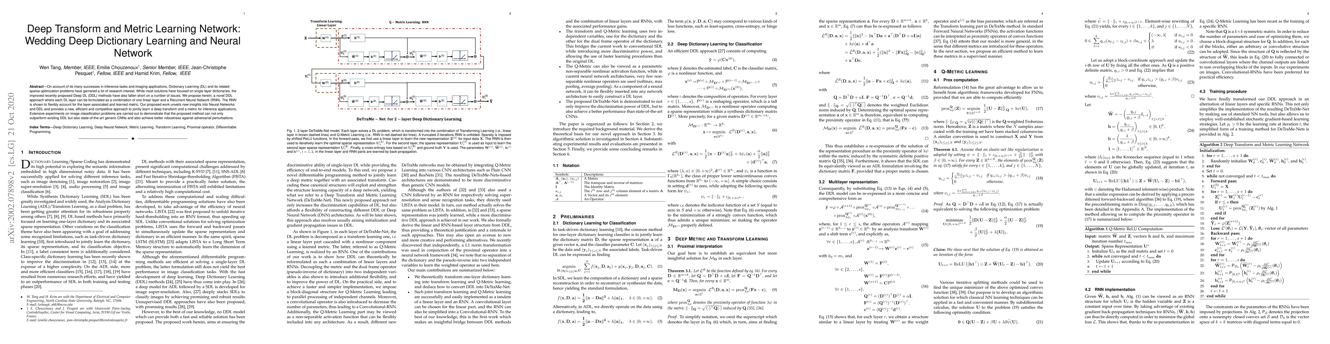 This paper proposes a novel Deep Transform and Metric Learning Network that combines Deep Dictionary Learning (DDL) with Recurrent Neural Networks (RNNs) to address limitations in existing DDL methods. The approach outperforms existing DDL and state-of-the-art CNNs in inference tasks, demonstrating its efficiency and competitiveness.