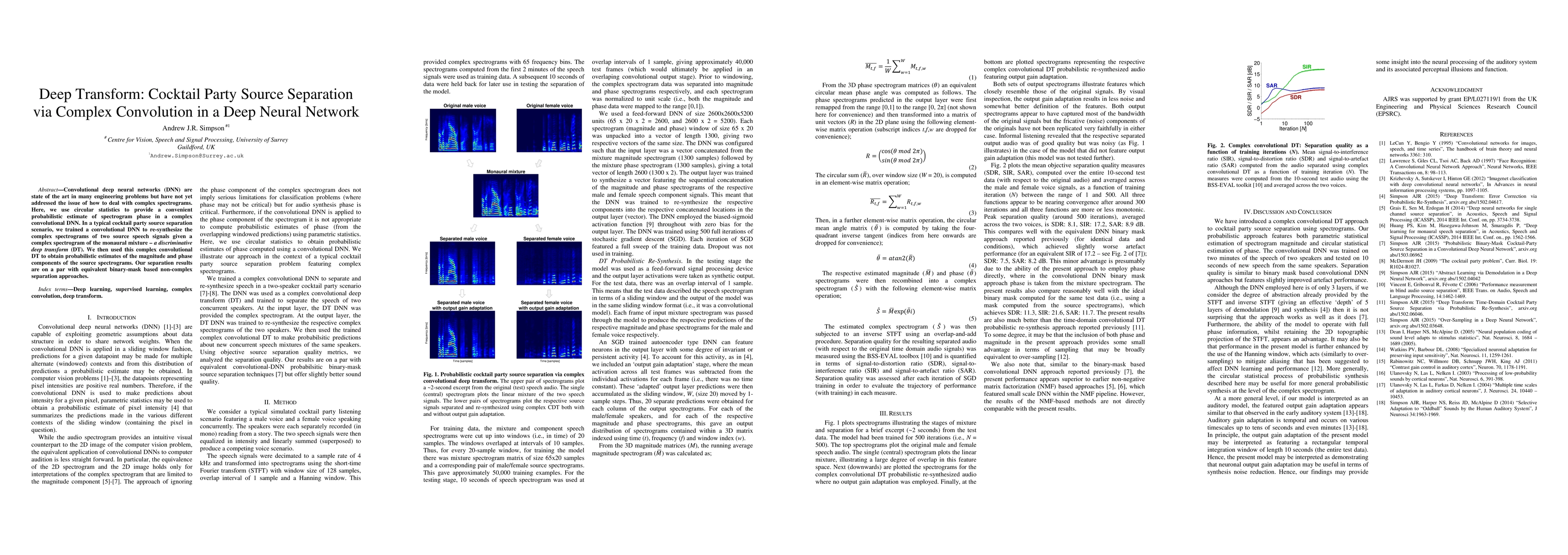 This paper proposes a complex convolutional deep neural network (DNN) for cocktail party source separation using circular statistics to estimate spectrogram phase. The discriminative deep transform (DT) achieves comparable separation results to binary-mask based methods.