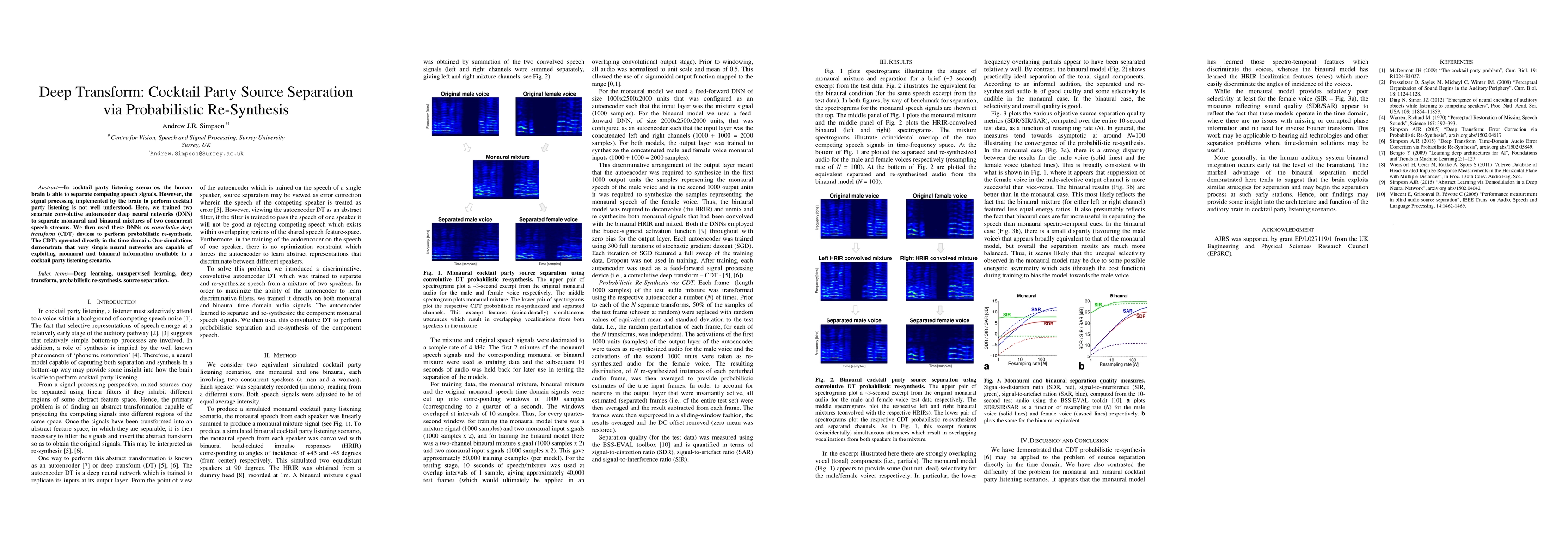This paper trains two convolutive autoencoder deep neural networks to separate mixed speech signals in a cocktail party scenario, using them as a convolutive deep transform (CDT) for probabilistic re-synthesis. The results show that simple neural networks can effectively exploit monaural and binaural information to achieve source separation.