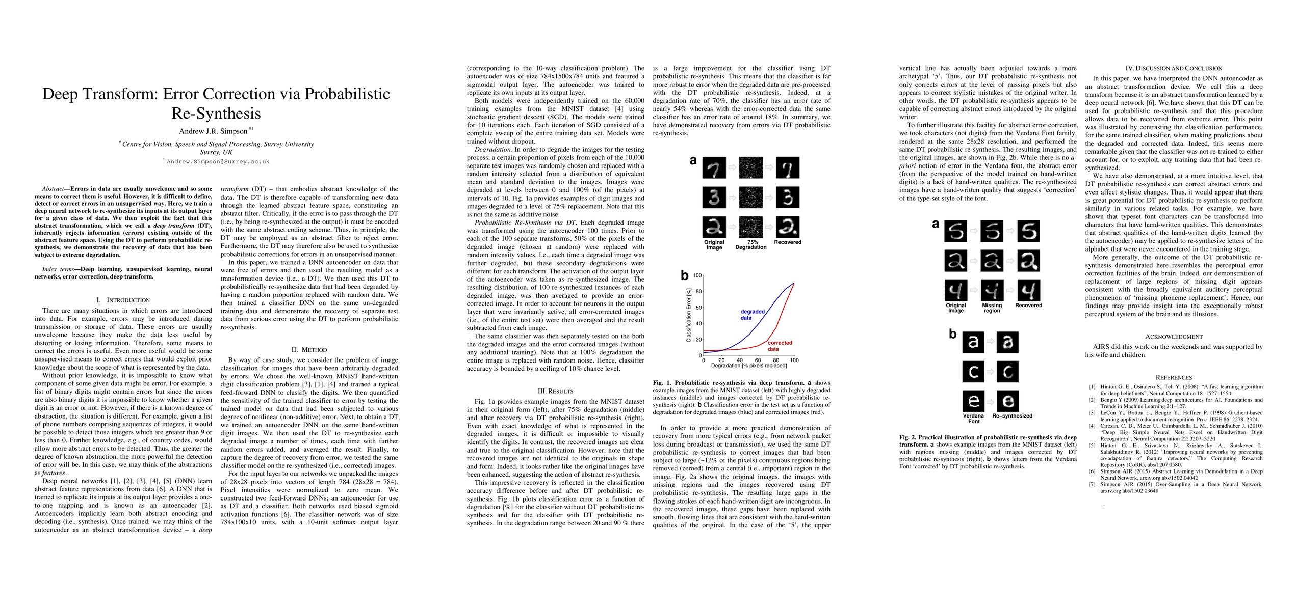 Errors in data are usually unwelcome and so some means to correct them is useful. However, it is difficult to define, detect or correct errors in an unsupervised way. Here, we train a deep neural network to re-synthesize its inputs at its output layer for a given class of data. We then exploit the fact that this abstract transformation, which we call a deep transform (DT), inherently rejects information (errors) existing outside of the abstract feature space. Using the DT to perform probabilistic re-synthesis, we demonstrate the recovery of data that has been subject to extreme degradation.