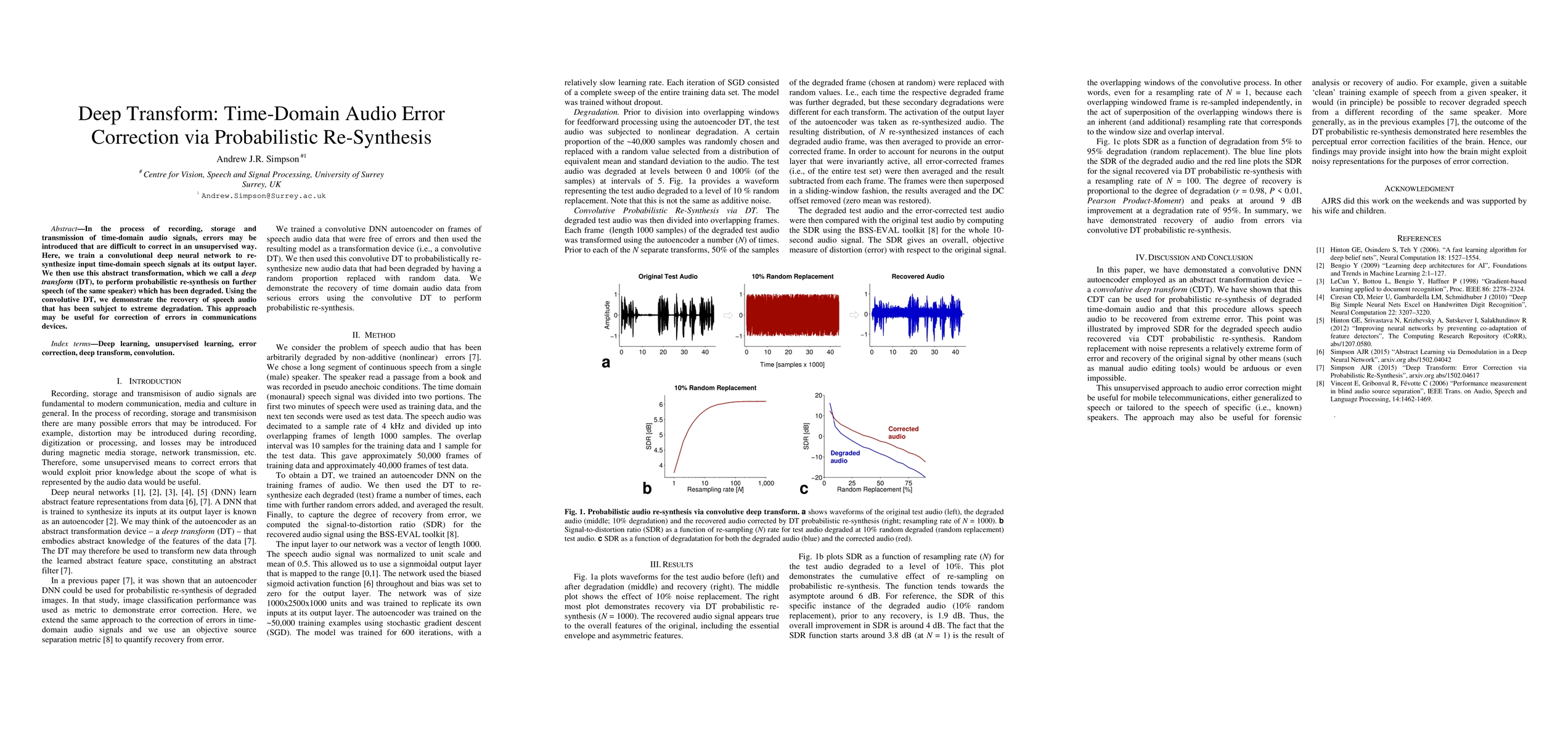 This paper proposes a convolutional deep neural network for correcting errors in time-domain audio signals through a probabilistic re-synthesis technique called deep transform (DT). The DT method effectively recovers degraded speech, potentially improving error correction in communication devices.