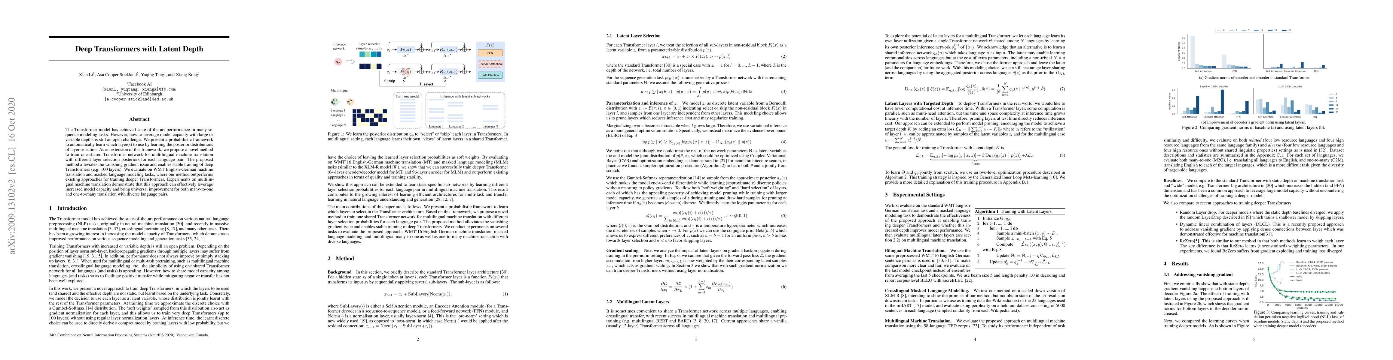 This paper introduces a probabilistic framework to automatically determine optimal layer usage in deep Transformers, enabling stable training of networks with up to 100 layers. The method also extends to multilingual machine translation, improving performance across diverse language pairs.
