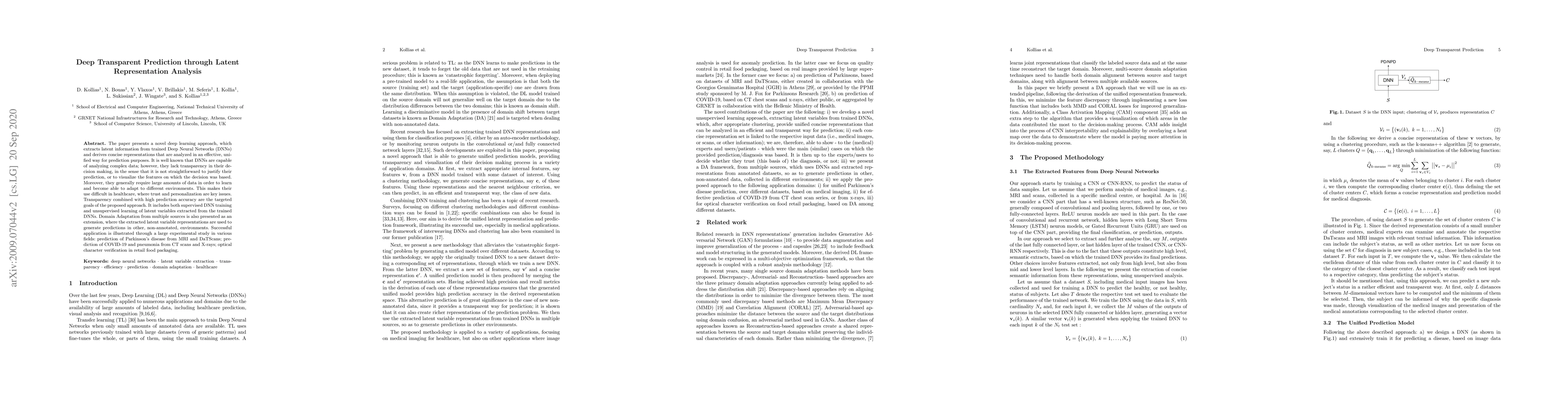 The paper presents a novel deep learning approach, which extracts latent information from trained Deep Neural Networks (DNNs) and derives concise representations that are analyzed in an effective, unified way for prediction purposes. It is well known that DNNs are capable of analyzing complex data; however, they lack transparency in their decision making, in the sense that it is not straightforward to justify their prediction, or to visualize the features on which the decision was based. Moreover, they generally require large amounts of data in order to learn and become able to adapt to different environments. This makes their use difficult in healthcare, where trust and personalization are key issues. Transparency combined with high prediction accuracy are the targeted goals of the proposed approach. It includes both supervised DNN training and unsupervised learning of latent variables extracted from the trained DNNs. Domain Adaptation from multiple sources is also presented as an extension, where the extracted latent variable representations are used to generate predictions in other, non-annotated, environments. Successful application is illustrated through a large experimental study in various fields: prediction of Parkinson's disease from MRI and DaTScans; prediction of COVID-19 and pneumonia from CT scans and X-rays; optical character verification in retail food packaging.