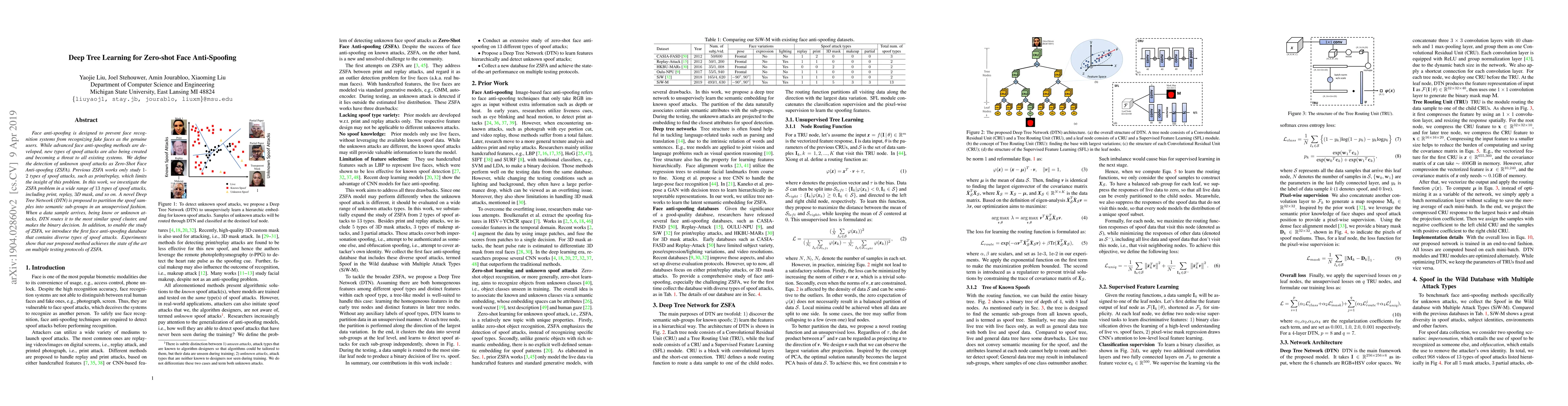 This paper proposes a Deep Tree Network (DTN) for Zero-Shot Face Anti-spoofing (ZSFA) to detect a wide range of 13 types of spoof attacks, including print, replay, and 3D mask attacks. The DTN partitions spoof samples into semantic sub-groups and routes new samples to the most similar cluster for binary decision-making, achieving state-of-the-art results.