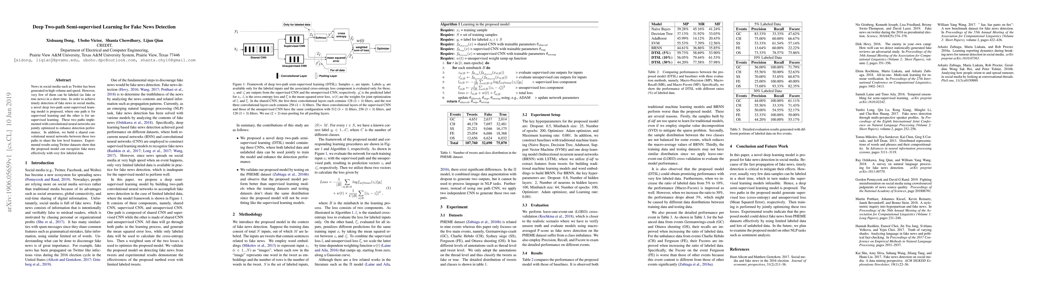 The paper proposes a deep two-path semi-supervised learning model for timely detection of fake news on social media, using convolutional neural networks for supervised and unsupervised learning. The model shares low-level features via a shared CNN, achieving effective fake news recognition with minimal labeled data.