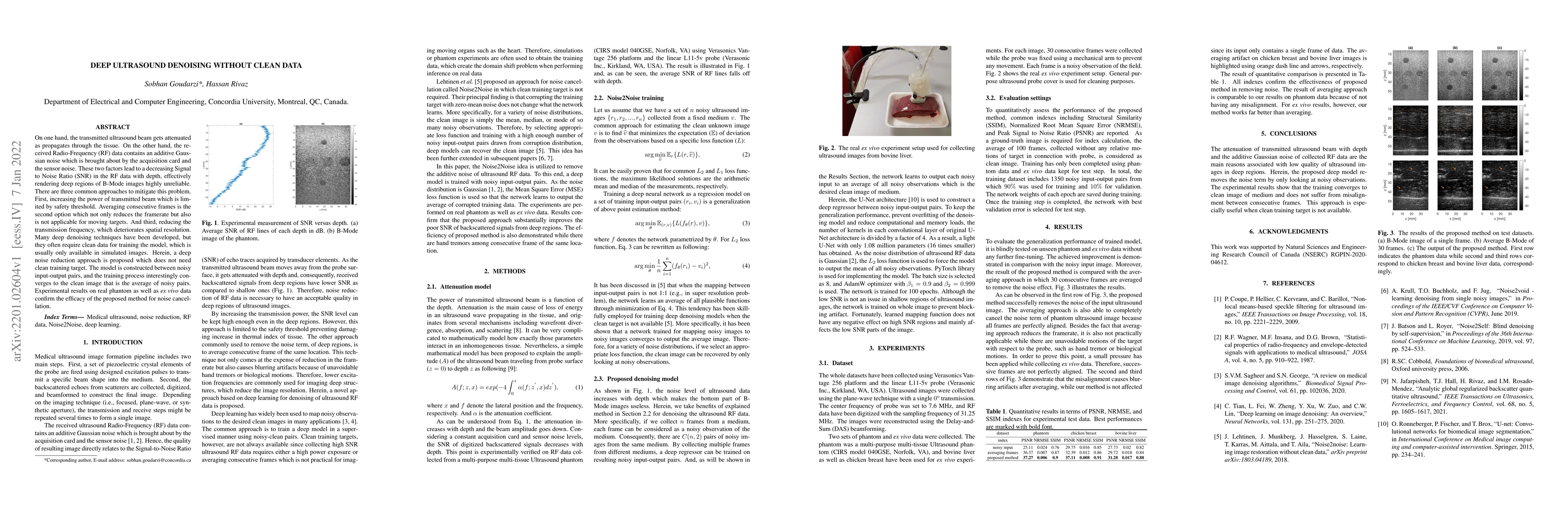 On one hand, the transmitted ultrasound beam gets attenuated as propagates through the tissue. On the other hand, the received Radio-Frequency (RF) data contains an additive Gaussian noise which is brought about by the acquisition card and the sensor noise. These two factors lead to a decreasing Signal to Noise Ratio (SNR) in the RF data with depth, effectively rendering deep regions of B-Mode images highly unreliable. There are three common approaches to mitigate this problem. First, increasing the power of transmitted beam which is limited by safety threshold. Averaging consecutive frames is the second option which not only reduces the framerate but also is not applicable for moving targets. And third, reducing the transmission frequency, which deteriorates spatial resolution. Many deep denoising techniques have been developed, but they often require clean data for training the model, which is usually only available in simulated images. Herein, a deep noise reduction approach is proposed which does not need clean training target. The model is constructed between noisy input-output pairs, and the training process interestingly converges to the clean image that is the average of noisy pairs. Experimental results on real phantom as well as ex vivo data confirm the efficacy of the proposed method for noise cancellation.