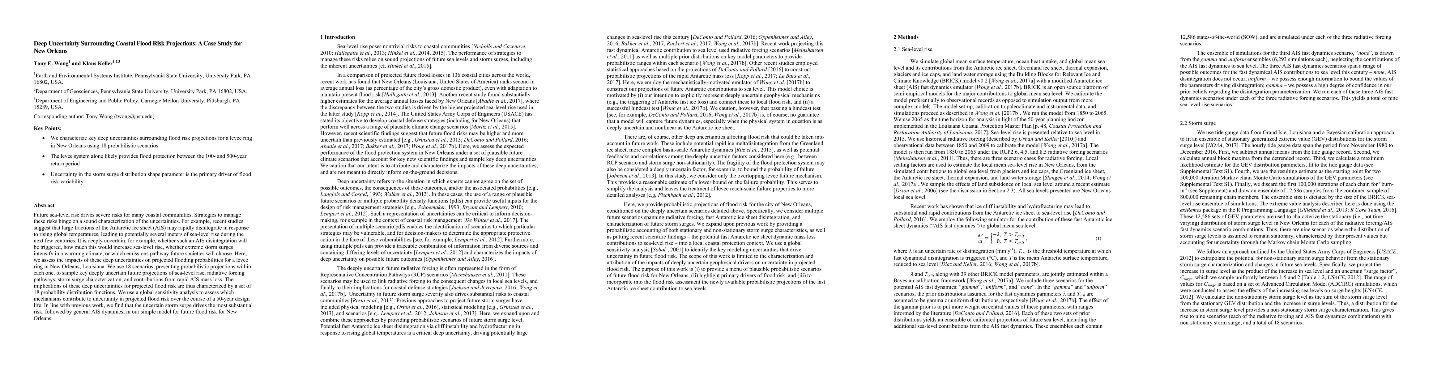 This study investigates the deep uncertainties affecting coastal flood risk projections for New Orleans, focusing on sea-level rise, storm surges, and Antarctic ice sheet dynamics. Using 18 probabilistic scenarios, it finds that uncertain storm surges pose the greatest risk, followed by rapid ice sheet disintegration, highlighting the complexity of future flood risk management.