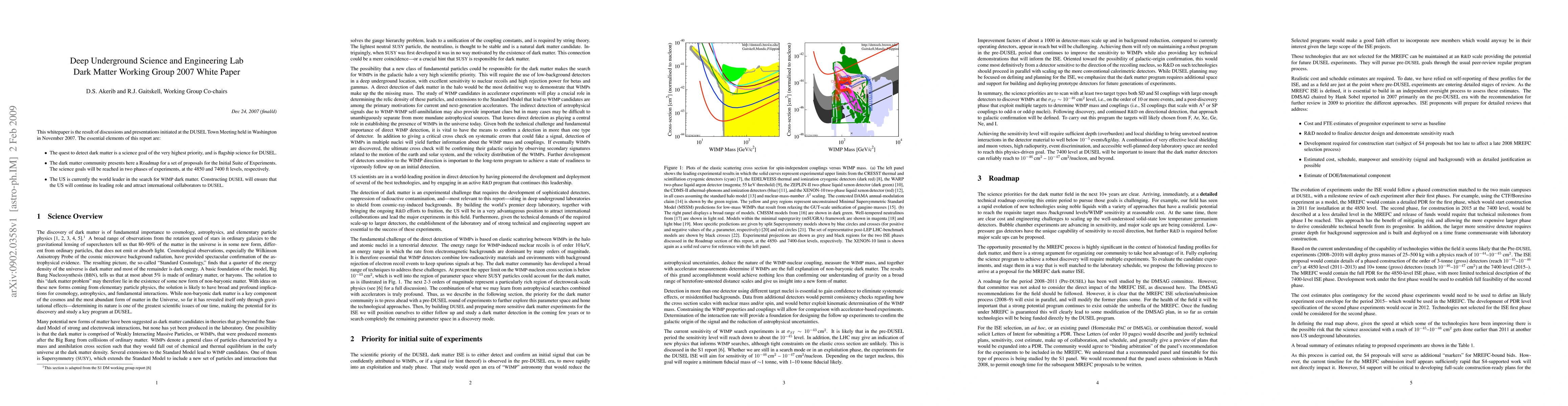 This whitepaper is the result of discussions and presentations initiated at the DUSEL Town Meeting held in Washington in November 2007. The essential elements of this report are: - The quest to detect dark matter is a science goal of the very highest priority, and is flagship science for DUSEL. - The dark matter community presents here a Roadmap for a set of proposals for the Initial Suite of Experiments. The science goals will be reached in two phases of experiments, at the 4850 and 7400 ft levels, respectively. - The US is currently the world leader in the search for WIMP dark matter. Constructing DUSEL will ensure that the US will continue its leading role and attract international collaborators to DUSEL.
