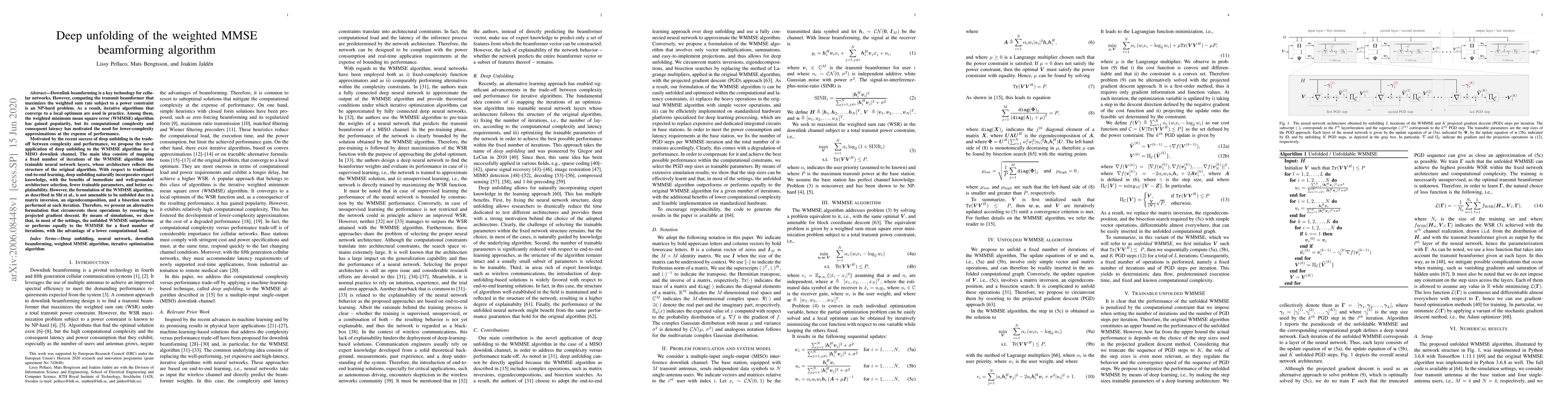 Downlink beamforming is a key technology for cellular networks. However, computing the transmit beamformer that maximizes the weighted sum rate subject to a power constraint is an NP-hard problem. As a result, iterative algorithms that converge to a local optimum are used in practice. Among them, the weighted minimum mean square error (WMMSE) algorithm has gained popularity, but its computational complexity and consequent latency has motivated the need for lower-complexity approximations at the expense of performance. Motivated by the recent success of deep unfolding in the trade-off between complexity and performance, we propose the novel application of deep unfolding to the WMMSE algorithm for a MISO downlink channel. The main idea consists of mapping a fixed number of iterations of the WMMSE algorithm into trainable neural network layers, whose architecture reflects the structure of the original algorithm. With respect to traditional end-to-end learning, deep unfolding naturally incorporates expert knowledge, with the benefits of immediate and well-grounded architecture selection, fewer trainable parameters, and better explainability. However, the formulation of the WMMSE algorithm, as described in Shi et al., is not amenable to be unfolded due to a matrix inversion, an eigendecomposition, and a bisection search performed at each iteration. Therefore, we present an alternative formulation that circumvents these operations by resorting to projected gradient descent. By means of simulations, we show that, in most of the settings, the unfolded WMMSE outperforms or performs equally to the WMMSE for a fixed number of iterations, with the advantage of a lower computational load.