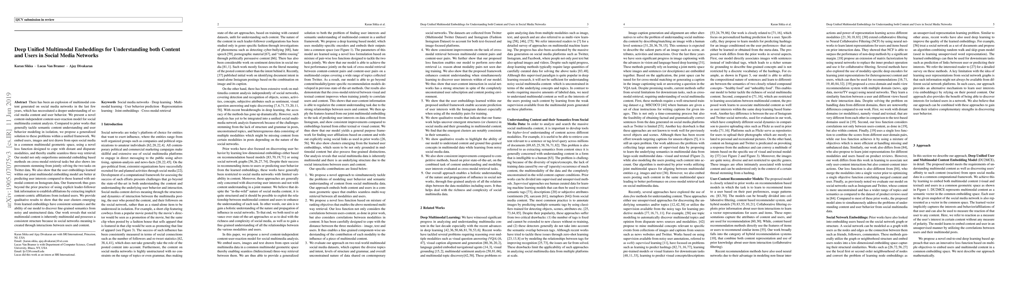 This paper proposes a unified multimodal embedding framework to analyze social media content and user behavior, embedding users, images, and text into a common geometric space. The model outperforms unimodal methods in cross-modal retrieval and better predicts user interests, revealing the inherent multimodal structure of social media content through user-content interactions.