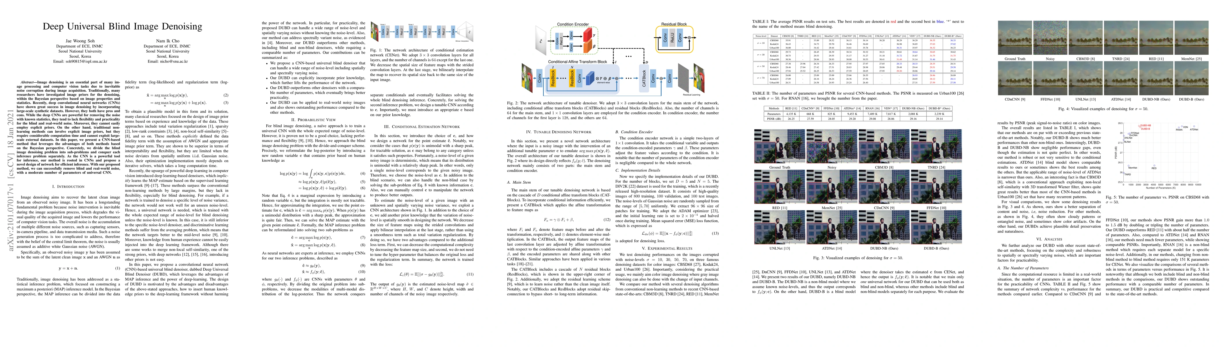 Image denoising is an essential part of many image processing and computer vision tasks due to inevitable noise corruption during image acquisition. Traditionally, many researchers have investigated image priors for the denoising, within the Bayesian perspective based on image properties and statistics. Recently, deep convolutional neural networks (CNNs) have shown great success in image denoising by incorporating large-scale synthetic datasets. However, they both have pros and cons. While the deep CNNs are powerful for removing the noise with known statistics, they tend to lack flexibility and practicality for the blind and real-world noise. Moreover, they cannot easily employ explicit priors. On the other hand, traditional non-learning methods can involve explicit image priors, but they require considerable computation time and cannot exploit large-scale external datasets. In this paper, we present a CNN-based method that leverages the advantages of both methods based on the Bayesian perspective. Concretely, we divide the blind image denoising problem into sub-problems and conquer each inference problem separately. As the CNN is a powerful tool for inference, our method is rooted in CNNs and propose a novel design of network for efficient inference. With our proposed method, we can successfully remove blind and real-world noise, with a moderate number of parameters of universal CNN.