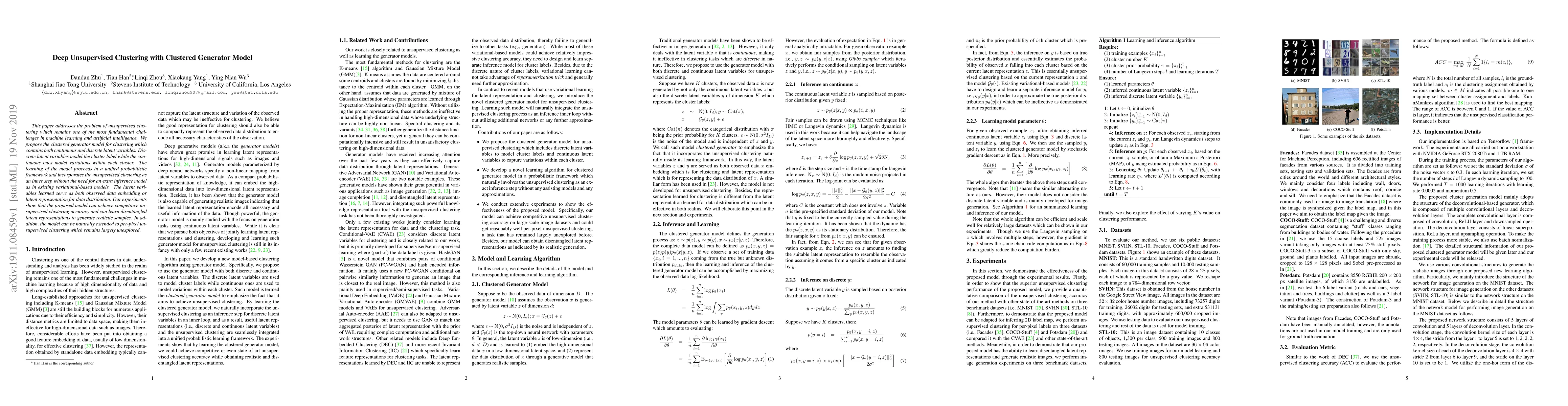 This paper addresses the problem of unsupervised clustering which remains one of the most fundamental challenges in machine learning and artificial intelligence. We propose the clustered generator model for clustering which contains both continuous and discrete latent variables. Discrete latent variables model the cluster label while the continuous ones model variations within each cluster. The learning of the model proceeds in a unified probabilistic framework and incorporates the unsupervised clustering as an inner step without the need for an extra inference model as in existing variational-based models. The latent variables learned serve as both observed data embedding or latent representation for data distribution. Our experiments show that the proposed model can achieve competitive unsupervised clustering accuracy and can learn disentangled latent representations to generate realistic samples. In addition, the model can be naturally extended to per-pixel unsupervised clustering which remains largely unexplored.