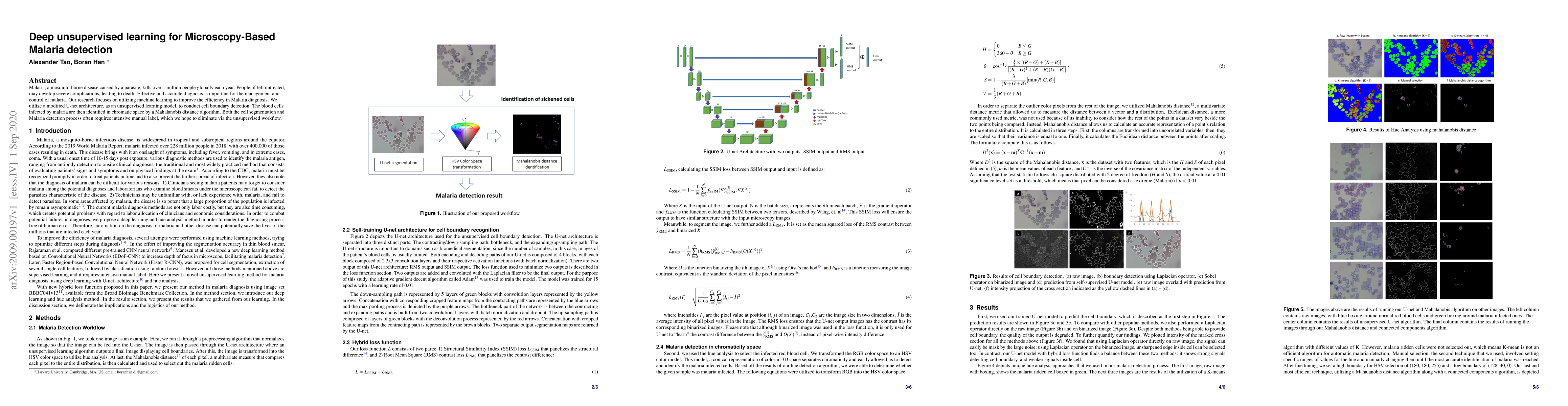 Malaria, a mosquito-borne disease caused by a parasite, kills over 1 million people globally each year. People, if left untreated, may develop severe complications, leading to death. Effective and accurate diagnosis is important for the management and control of malaria. Our research focuses on utilizing machine learning to improve the efficiency in Malaria diagnosis. We utilize a modified U-net architecture, as an unsupervised learning model, to conduct cell boundary detection. The blood cells infected by malaria are then identified in chromatic space by a Mahalanobis distance algorithm. Both the cell segmentation and Malaria detection process often requires intensive manual label, which we hope to eliminate via the unsupervised workflow.