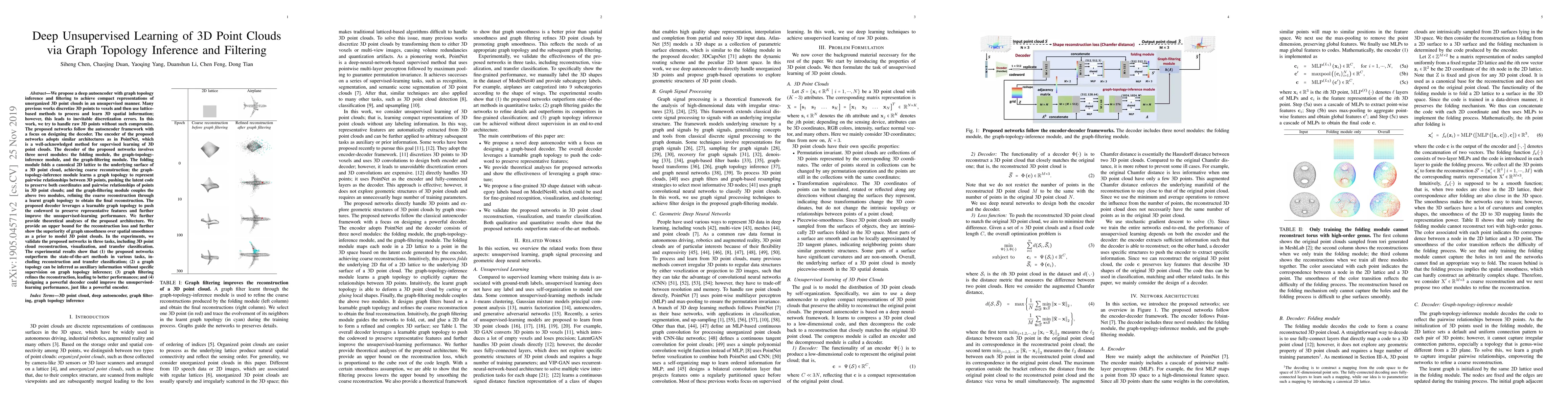 We propose a deep autoencoder with graph topology inference and filtering to achieve compact representations of unorganized 3D point clouds in an unsupervised manner. Many previous works discretize 3D points to voxels and then use lattice-based methods to process and learn 3D spatial information; however, this leads to inevitable discretization errors. In this work, we handle raw 3D points without such compromise. The proposed networks follow the autoencoder framework with a focus on designing the decoder. The encoder adopts similar architectures as in PointNet. The decoder involves three novel modules. The folding module folds a canonical 2D lattice to the underlying surface of a 3D point cloud, achieving coarse reconstruction; the graph-topology-inference module learns a graph topology to represent pairwise relationships between 3D points, pushing the latent code to preserve both coordinates and pairwise relationships of points in 3D point clouds; and the graph-filtering module couples the above two modules, refining the coarse reconstruction through a learnt graph topology to obtain the final reconstruction. The proposed decoder leverages a learnable graph topology to push the codeword to preserve representative features and further improve the unsupervised-learning performance. We further provide theoretical analyses of the proposed architecture. In the experiments, we validate the proposed networks in three tasks, including 3D point cloud reconstruction, visualization, and transfer classification. The experimental results show that (1) the proposed networks outperform the state-of-the-art methods in various tasks; (2) a graph topology can be inferred as auxiliary information without specific supervision on graph topology inference; and (3) graph filtering refines the reconstruction, leading to better performances.