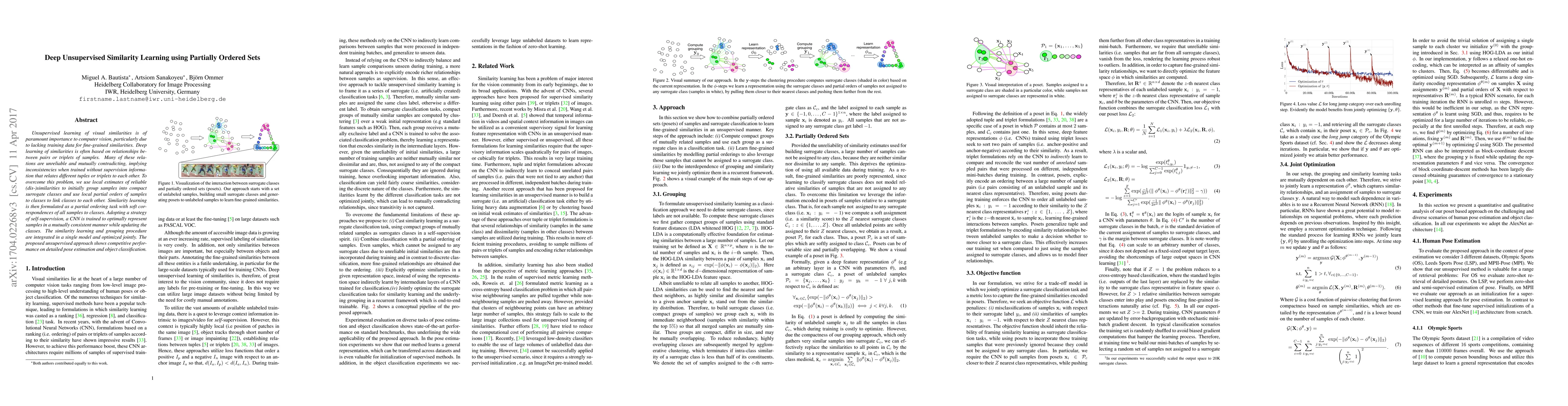This paper proposes an unsupervised deep learning method for visual similarity learning using partially ordered sets to group samples into classes and link them consistently. The approach leverages self-supervision and a CNN to achieve competitive performance on tasks like pose estimation and object classification.