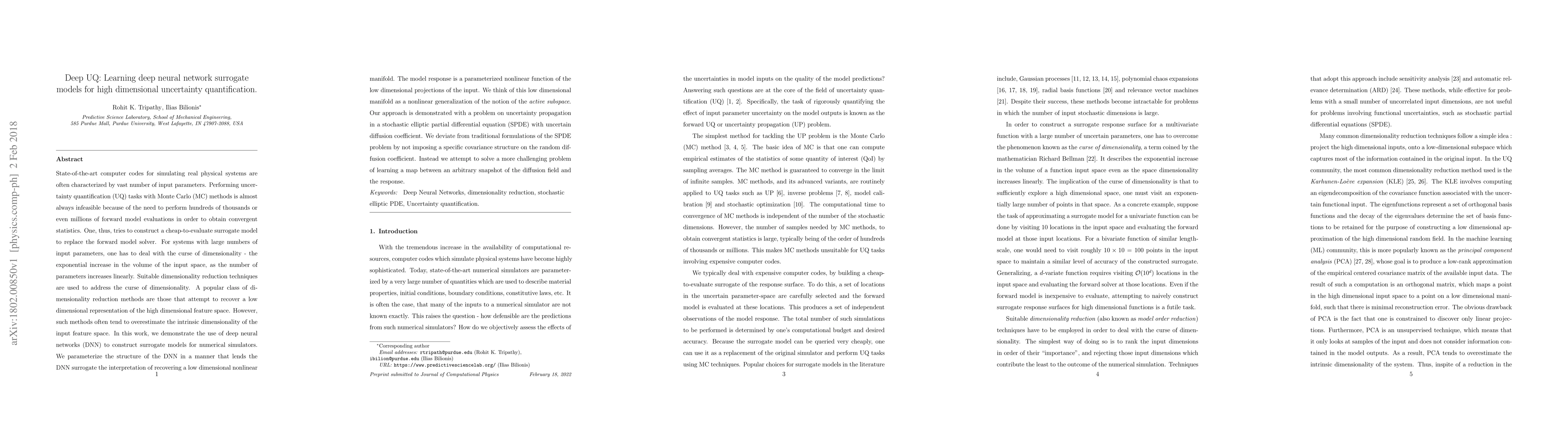State-of-the-art computer codes for simulating real physical systems are often characterized by a vast number of input parameters. Performing uncertainty quantification (UQ) tasks with Monte Carlo (MC) methods is almost always infeasible because of the need to perform hundreds of thousands or even millions of forward model evaluations in order to obtain convergent statistics. One, thus, tries to construct a cheap-to-evaluate surrogate model to replace the forward model solver. For systems with large numbers of input parameters, one has to deal with the curse of dimensionality - the exponential increase in the volume of the input space, as the number of parameters increases linearly. In this work, we demonstrate the use of deep neural networks (DNN) to construct surrogate models for numerical simulators. We parameterize the structure of the DNN in a manner that lends the DNN surrogate the interpretation of recovering a low dimensional nonlinear manifold. The model response is a parameterized nonlinear function of the low dimensional projections of the input. We think of this low dimensional manifold as a nonlinear generalization of the notion of the active subspace. Our approach is demonstrated with a problem on uncertainty propagation in a stochastic elliptic partial differential equation (SPDE) with uncertain diffusion coefficient. We deviate from traditional formulations of the SPDE problem by not imposing a specific covariance structure on the random diffusion coefficient. Instead, we attempt to solve a more challenging problem of learning a map between an arbitrary snapshot of the diffusion field and the response.