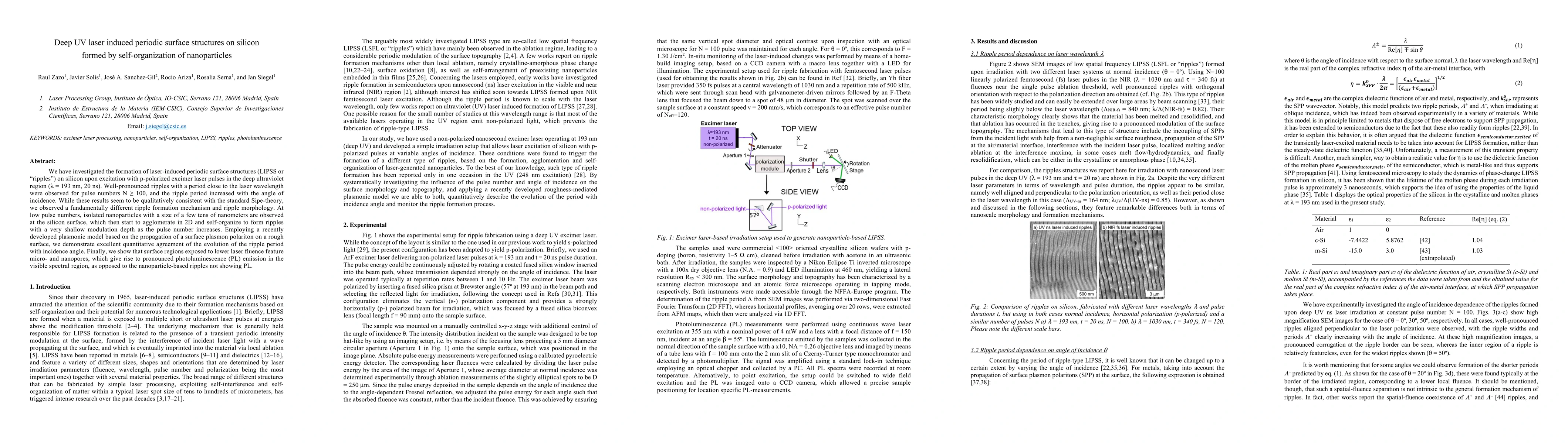 The research explores deep UV laser-induced periodic surface structures on silicon, observing ripple formation with a period close to the laser wavelength. Uniquely, it identifies that at low pulse numbers, nanoparticles agglomerate to form ripples, differing from standard theories. A plasmonic model accurately predicts ripple period evolution with incidence angle, and lower fluence areas show micro- and nanopores causing visible photoluminescence, unlike nanoparticle-based ripples.