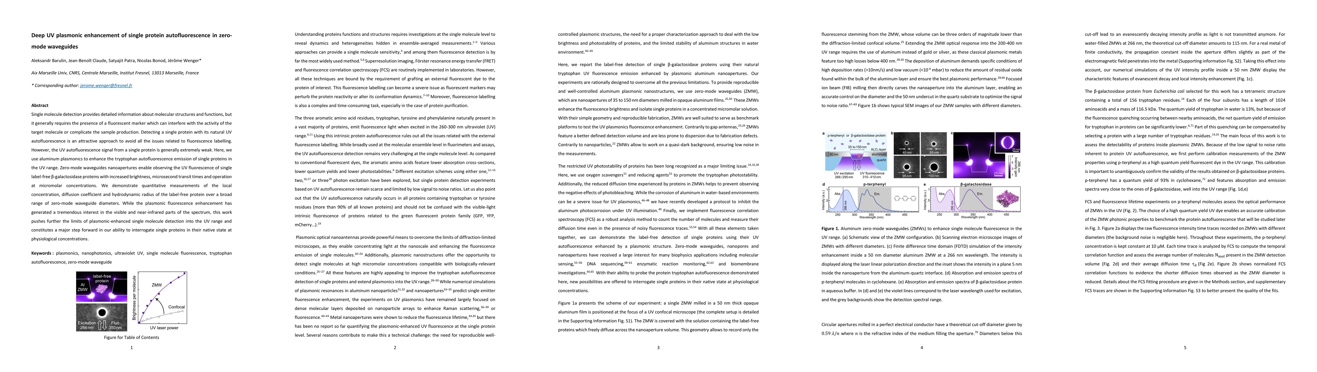 This paper demonstrates the use of aluminum plasmonics and zero-mode waveguides to significantly enhance the UV autofluorescence of single proteins, enabling detailed, label-free detection and analysis of beta-galactosidase proteins. This advancement allows for quantitative measurements of protein concentration, diffusion, and size without the need for fluorescent labels.