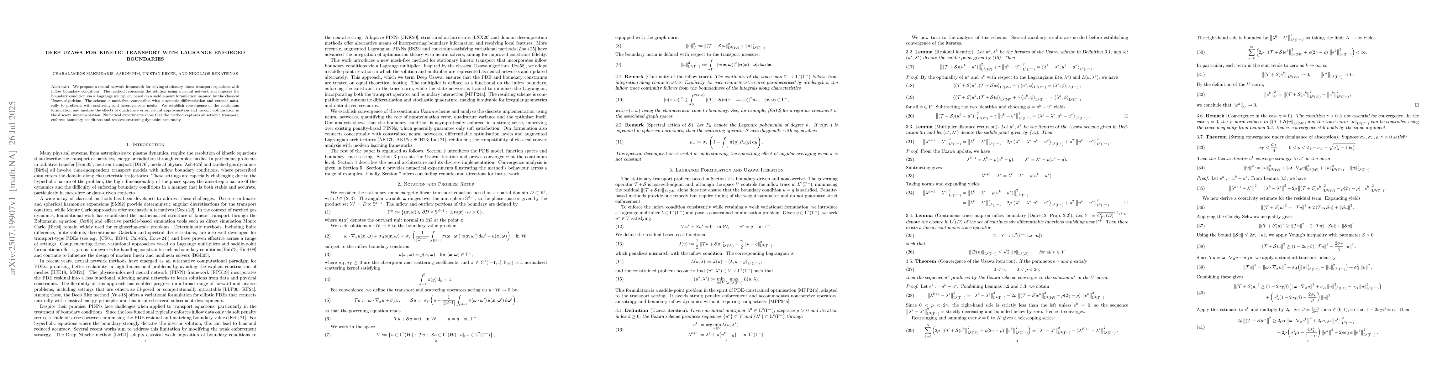 We propose a neural network framework for solving stationary linear transport equations with inflow boundary conditions. The method represents the solution using a neural network and imposes the boundary condition via a Lagrange multiplier, based on a saddle-point formulation inspired by the classical Uzawa algorithm. The scheme is mesh-free, compatible with automatic differentiation and extends naturally to problems with scattering and heterogeneous media. We establish convergence of the continuum formulation and analyse the effects of quadrature error, neural approximation and inexact optimisation in the discrete implementation. Numerical experiments show that the method captures anisotropic transport, enforces boundary conditions and resolves scattering dynamics accurately.