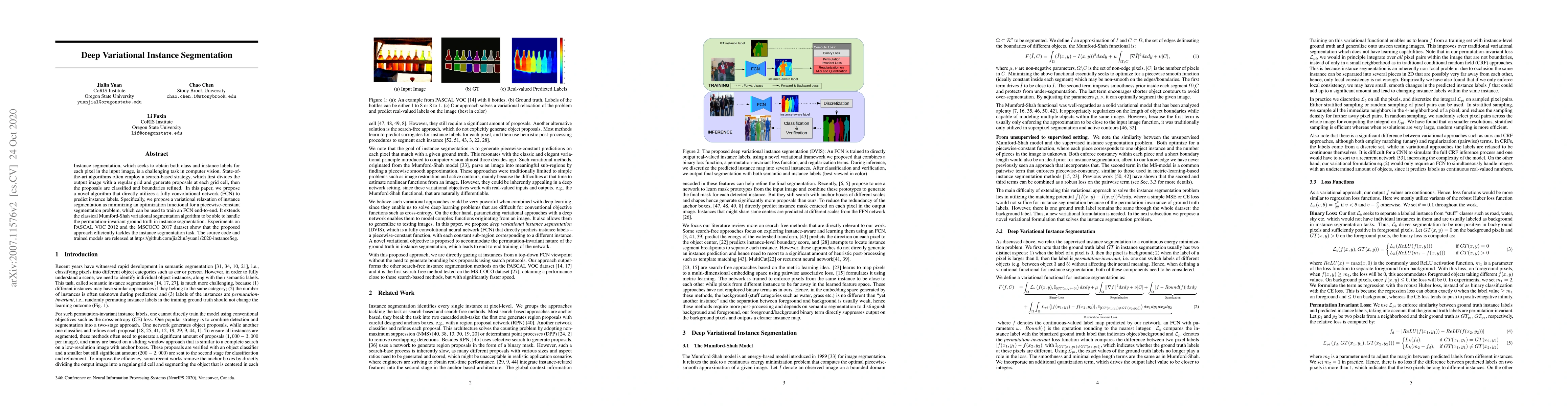 Instance Segmentation, which seeks to obtain both class and instance labels for each pixel in the input image, is a challenging task in computer vision. State-of-the-art algorithms often employ two separate stages, the first one generating object proposals and the second one recognizing and refining the boundaries. Further, proposals are usually based on detectors such as faster R-CNN which search for boxes in the entire image exhaustively. In this paper, we propose a novel algorithm that directly utilizes a fully convolutional network (FCN) to predict instance labels. Specifically, we propose a variational relaxation of instance segmentation as minimizing an optimization functional for a piecewise-constant segmentation problem, which can be used to train an FCN end-to-end. It extends the classical Mumford-Shah variational segmentation problem to be able to handle permutation-invariant labels in the ground truth of instance segmentation. Experiments on PASCAL VOC 2012, Semantic Boundaries dataset(SBD), and the MSCOCO 2017 dataset show that the proposed approach efficiently tackle the instance segmentation task. The source code and trained models will be released with the paper.