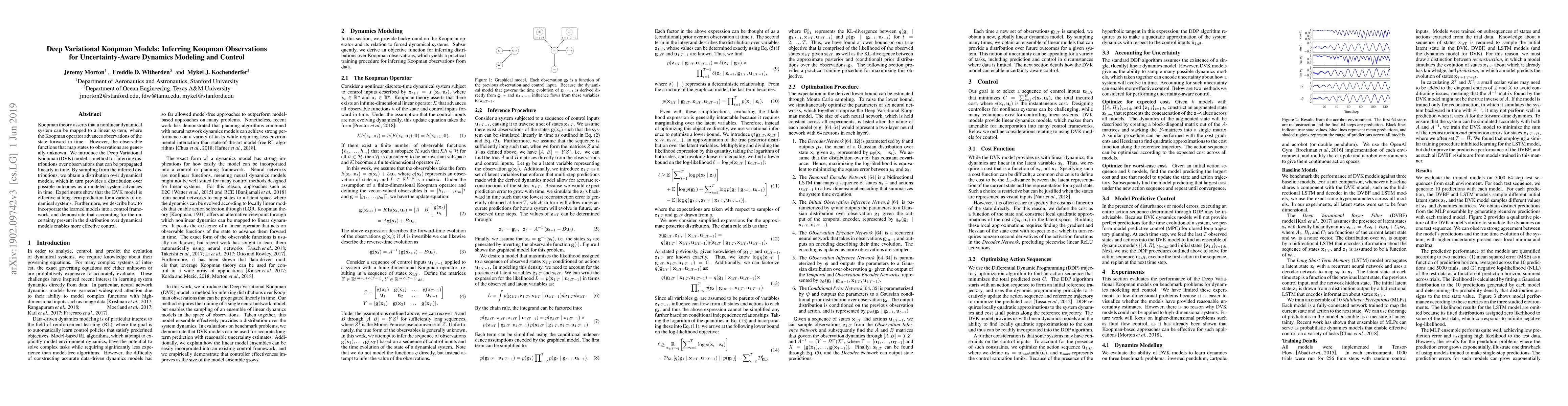 Koopman theory asserts that a nonlinear dynamical system can be mapped to a linear system, where the Koopman operator advances observations of the state forward in time. However, the observable functions that map states to observations are generally unknown. We introduce the Deep Variational Koopman (DVK) model, a method for inferring distributions over observations that can be propagated linearly in time. By sampling from the inferred distributions, we obtain a distribution over dynamical models, which in turn provides a distribution over possible outcomes as a modeled system advances in time. Experiments show that the DVK model is effective at long-term prediction for a variety of dynamical systems. Furthermore, we describe how to incorporate the learned models into a control framework, and demonstrate that accounting for the uncertainty present in the distribution over dynamical models enables more effective control.
