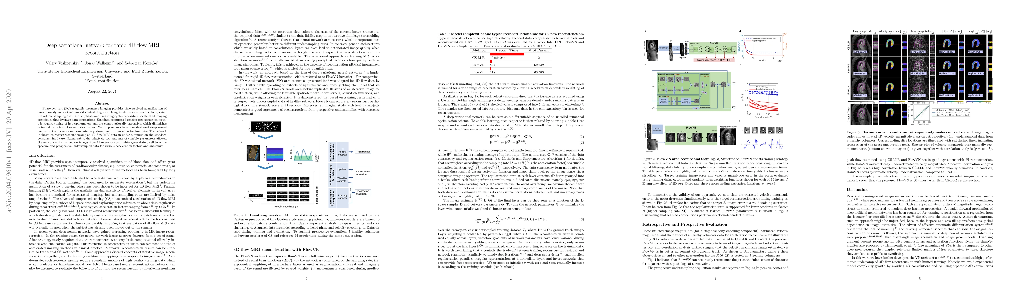 This paper proposes a deep variational network for rapid reconstruction of 4D flow MRI, significantly reducing scan times through efficient model-based neural reconstruction. The network generalizes well with minimal training data and achieves reconstruction in under a minute, outperforming traditional compressed sensing methods.