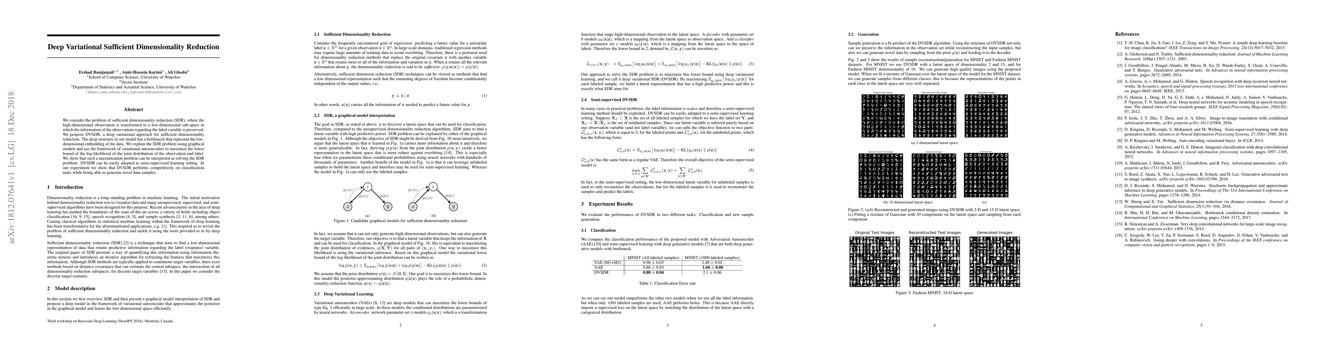 This paper proposes DVSDR, a deep variational approach for sufficient dimensionality reduction, which transforms high-dimensional data into a lower-dimensional space while preserving information relevant to a label variable. The method leverages variational autoencoders and is shown to perform competitively in classification tasks and data generation.