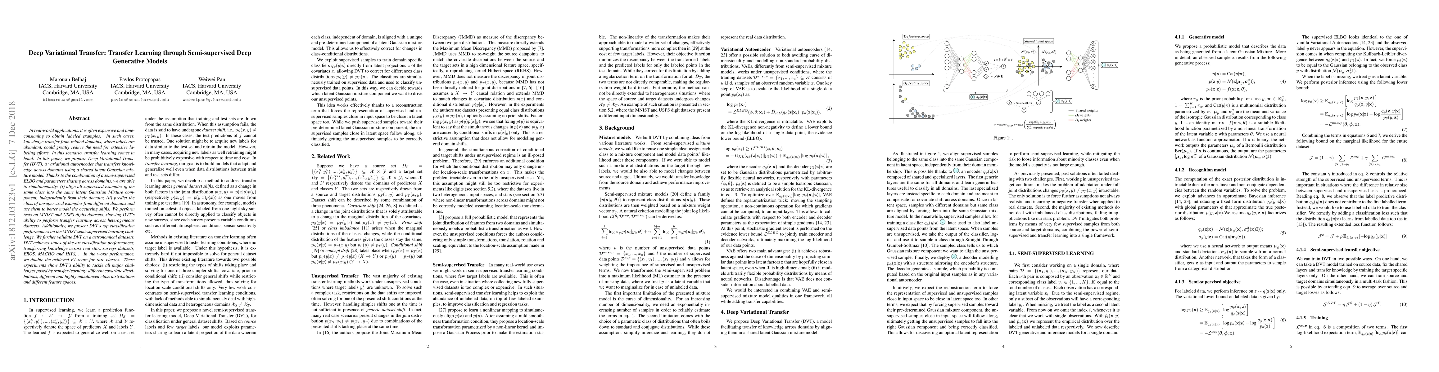 The research introduces Deep Variational Transfer (DVT), a variational autoencoder that transfers knowledge across domains using a shared latent Gaussian mixture model. DVT combines a semi-supervised ELBO with parameter sharing across domains to simultaneously align supervised examples of the same class into the same latent Gaussian component, independent of their domain, and predict the class of unsupervised examples from different domains.