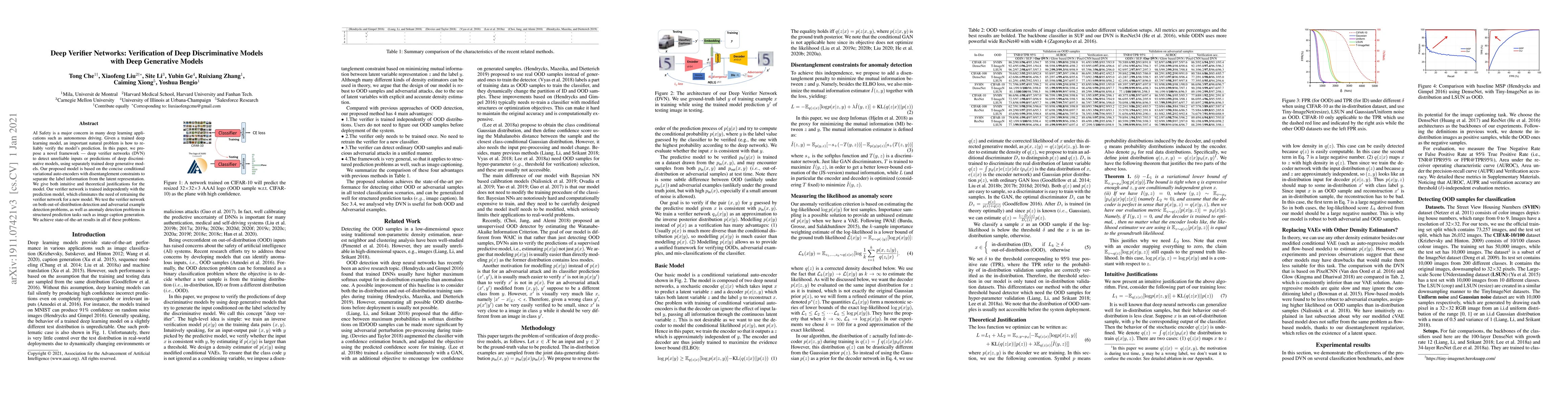 AI Safety is a major concern in many deep learning applications such as autonomous driving. Given a trained deep learning model, an important natural problem is how to reliably verify the model's prediction. In this paper, we propose a novel framework -- deep verifier networks (DVN) to verify the inputs and outputs of deep discriminative models with deep generative models. Our proposed model is based on conditional variational auto-encoders with disentanglement constraints. We give both intuitive and theoretical justifications of the model. Our verifier network is trained independently with the prediction model, which eliminates the need of retraining the verifier network for a new model. We test the verifier network on out-of-distribution detection and adversarial example detection problems, as well as anomaly detection problems in structured prediction tasks such as image caption generation. We achieve state-of-the-art results in all of these problems.