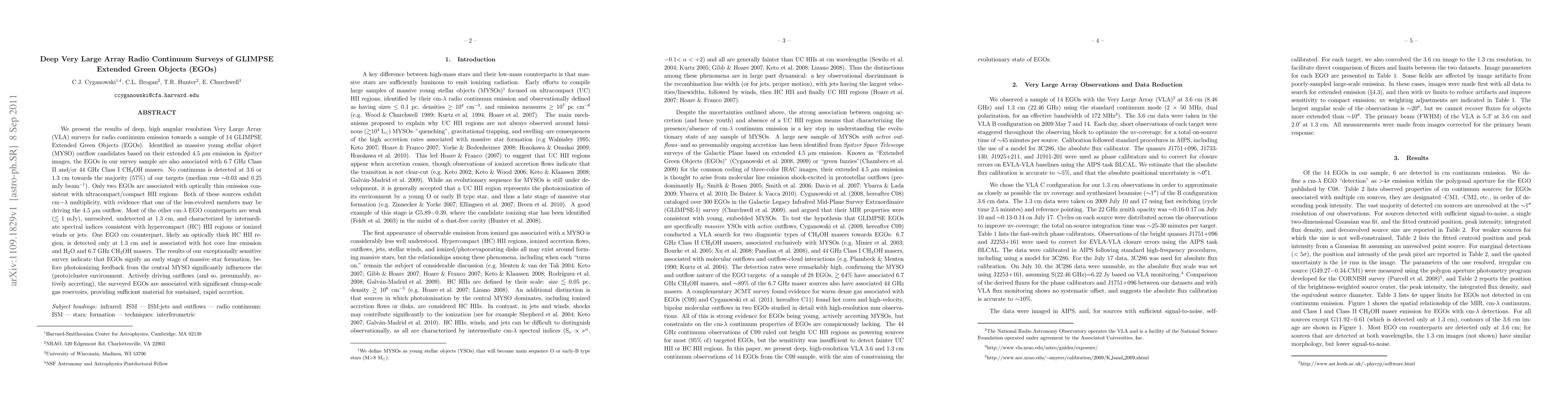 This study uses deep VLA surveys to investigate radio continuum emission from GLIMPSE Extended Green Objects (EGOs), identifying them as massive young stellar object outflow candidates. The majority of EGOs show no detectable radio continuum, indicating they represent an early stage of massive star formation before significant photoionizing feedback.