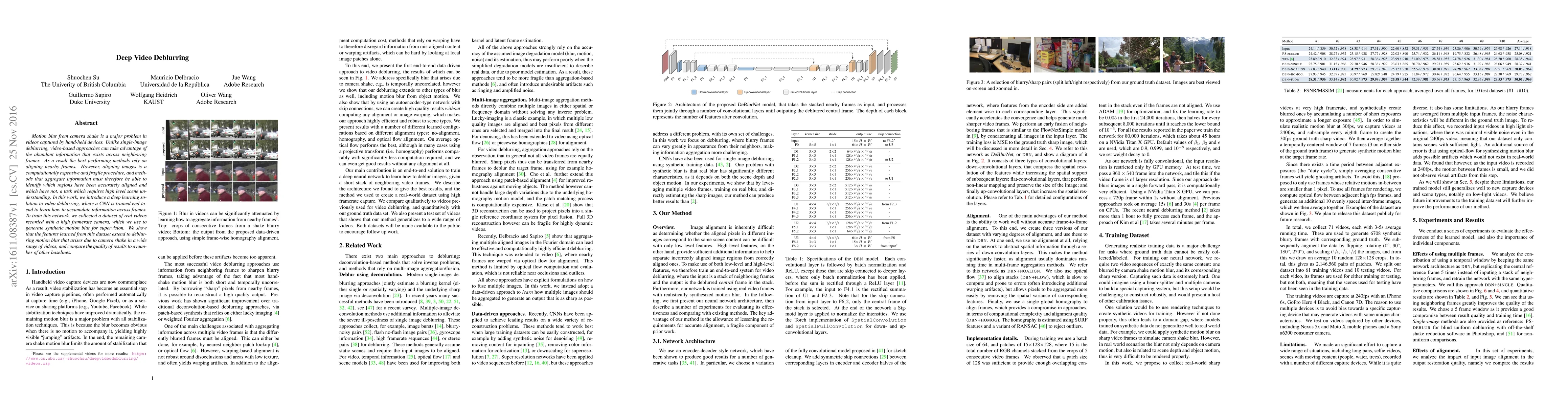 This paper proposes a deep learning approach for deblurring videos affected by camera shake, utilizing a CNN trained to accumulate information across frames. The method is evaluated using a dataset of real high framerate videos with synthetic motion blur, demonstrating effective deblurring across various videos.