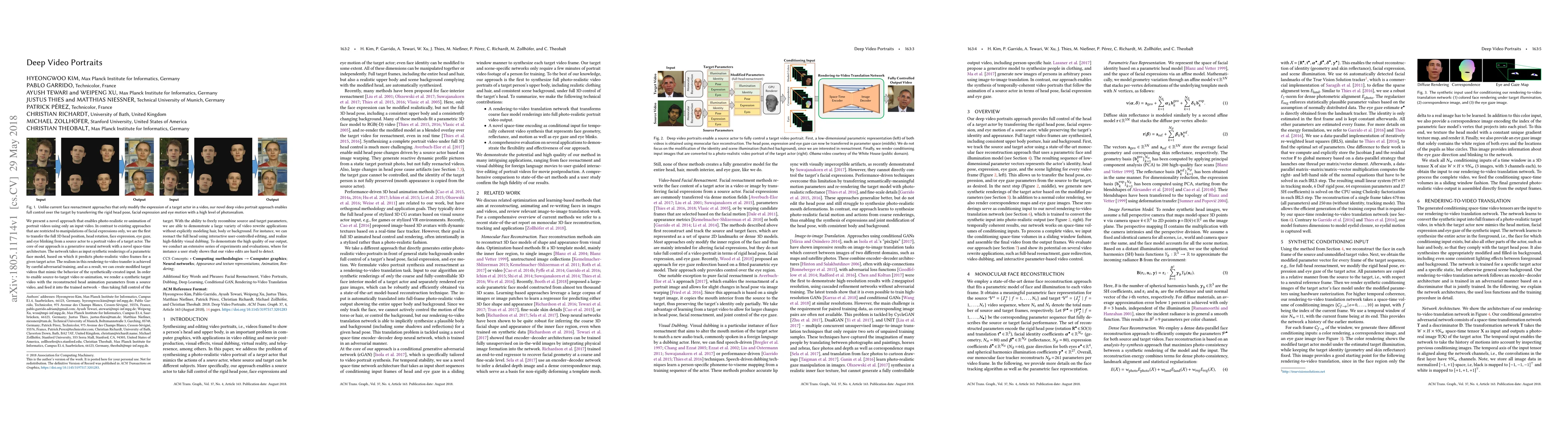 We present a novel approach that enables photo-realistic re-animation of portrait videos using only an input video. In contrast to existing approaches that are restricted to manipulations of facial expressions only, we are the first to transfer the full 3D head position, head rotation, face expression, eye gaze, and eye blinking from a source actor to a portrait video of a target actor. The core of our approach is a generative neural network with a novel space-time architecture. The network takes as input synthetic renderings of a parametric face model, based on which it predicts photo-realistic video frames for a given target actor. The realism in this rendering-to-video transfer is achieved by careful adversarial training, and as a result, we can create modified target videos that mimic the behavior of the synthetically-created input. In order to enable source-to-target video re-animation, we render a synthetic target video with the reconstructed head animation parameters from a source video, and feed it into the trained network -- thus taking full control of the target. With the ability to freely recombine source and target parameters, we are able to demonstrate a large variety of video rewrite applications without explicitly modeling hair, body or background. For instance, we can reenact the full head using interactive user-controlled editing, and realize high-fidelity visual dubbing. To demonstrate the high quality of our output, we conduct an extensive series of experiments and evaluations, where for instance a user study shows that our video edits are hard to detect.