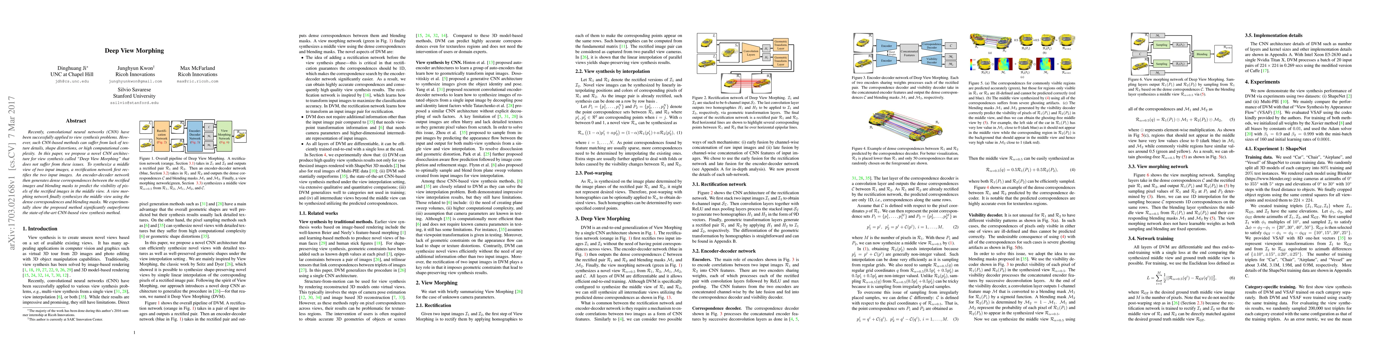 Recently, convolutional neural networks (CNN) have been successfully applied to view synthesis problems. However, such CNN-based methods can suffer from lack of texture details, shape distortions, or high computational complexity. In this paper, we propose a novel CNN architecture for view synthesis called "Deep View Morphing" that does not suffer from these issues. To synthesize a middle view of two input images, a rectification network first rectifies the two input images. An encoder-decoder network then generates dense correspondences between the rectified images and blending masks to predict the visibility of pixels of the rectified images in the middle view. A view morphing network finally synthesizes the middle view using the dense correspondences and blending masks. We experimentally show the proposed method significantly outperforms the state-of-the-art CNN-based view synthesis method.