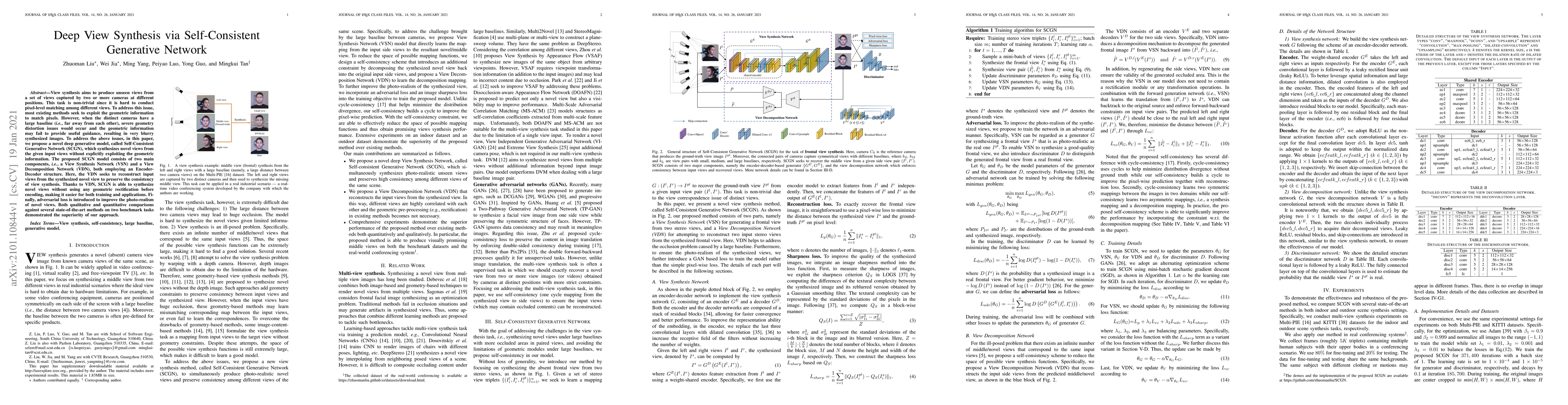 View synthesis aims to produce unseen views from a set of views captured by two or more cameras at different positions. This task is non-trivial since it is hard to conduct pixel-level matching among different views. To address this issue, most existing methods seek to exploit the geometric information to match pixels. However, when the distinct cameras have a large baseline (i.e., far away from each other), severe geometry distortion issues would occur and the geometric information may fail to provide useful guidance, resulting in very blurry synthesized images. To address the above issues, in this paper, we propose a novel deep generative model, called Self-Consistent Generative Network (SCGN), which synthesizes novel views from the given input views without explicitly exploiting the geometric information. The proposed SCGN model consists of two main components, i.e., a View Synthesis Network (VSN) and a View Decomposition Network (VDN), both employing an Encoder-Decoder structure. Here, the VDN seeks to reconstruct input views from the synthesized novel view to preserve the consistency of view synthesis. Thanks to VDN, SCGN is able to synthesize novel views without using any geometric rectification before encoding, making it easier for both training and applications. Finally, adversarial loss is introduced to improve the photo-realism of novel views. Both qualitative and quantitative comparisons against several state-of-the-art methods on two benchmark tasks demonstrated the superiority of our approach.