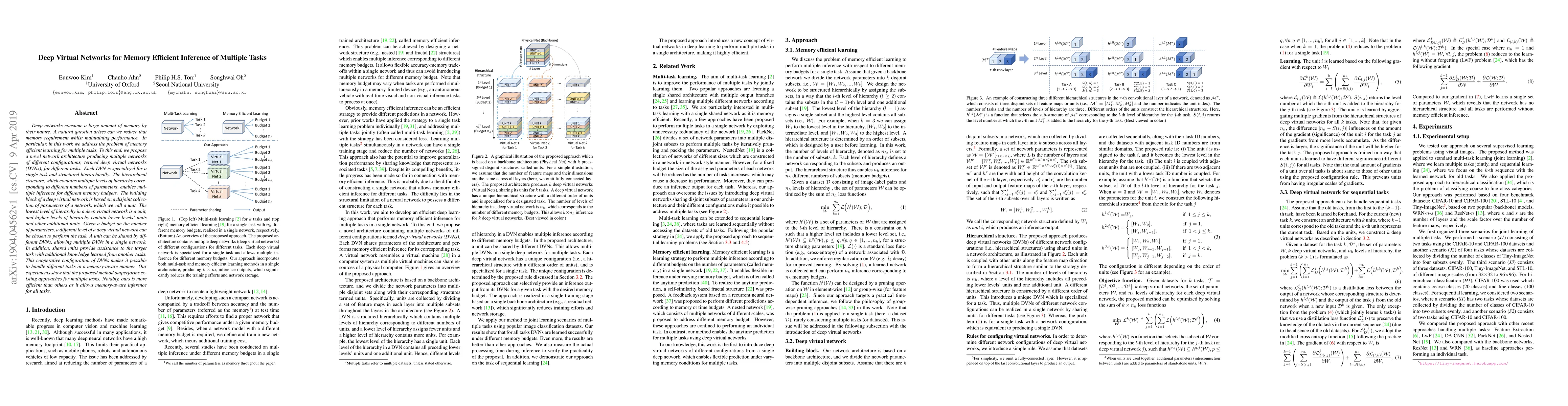 This paper proposes deep virtual networks (DVNs) to enable memory-efficient inference for multiple tasks by creating specialized, hierarchically structured networks with shared parameter units. The method allows for flexible memory allocation across tasks, outperforming existing approaches in efficiency and performance.