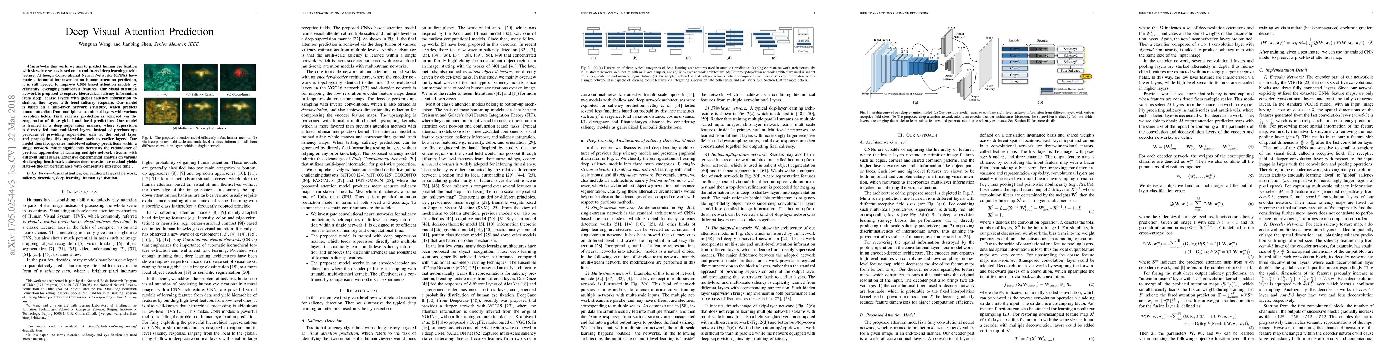In this work, we aim to predict human eye fixation with view-free scenes based on an end-to-end deep learning architecture. Although Convolutional Neural Networks (CNNs) have made substantial improvement on human attention prediction, it is still needed to improve CNN based attention models by efficiently leveraging multi-scale features. Our visual attention network is proposed to capture hierarchical saliency information from deep, coarse layers with global saliency information to shallow, fine layers with local saliency response. Our model is based on a skip-layer network structure, which predicts human attention from multiple convolutional layers with various reception fields. Final saliency prediction is achieved via the cooperation of those global and local predictions. Our model is learned in a deep supervision manner, where supervision is directly fed into multi-level layers, instead of previous approaches of providing supervision only at the output layer and propagating this supervision back to earlier layers. Our model thus incorporates multi-level saliency predictions within a single network, which significantly decreases the redundancy of previous approaches of learning multiple network streams with different input scales. Extensive experimental analysis on various challenging benchmark datasets demonstrate our method yields state-of-the-art performance with competitive inference time.