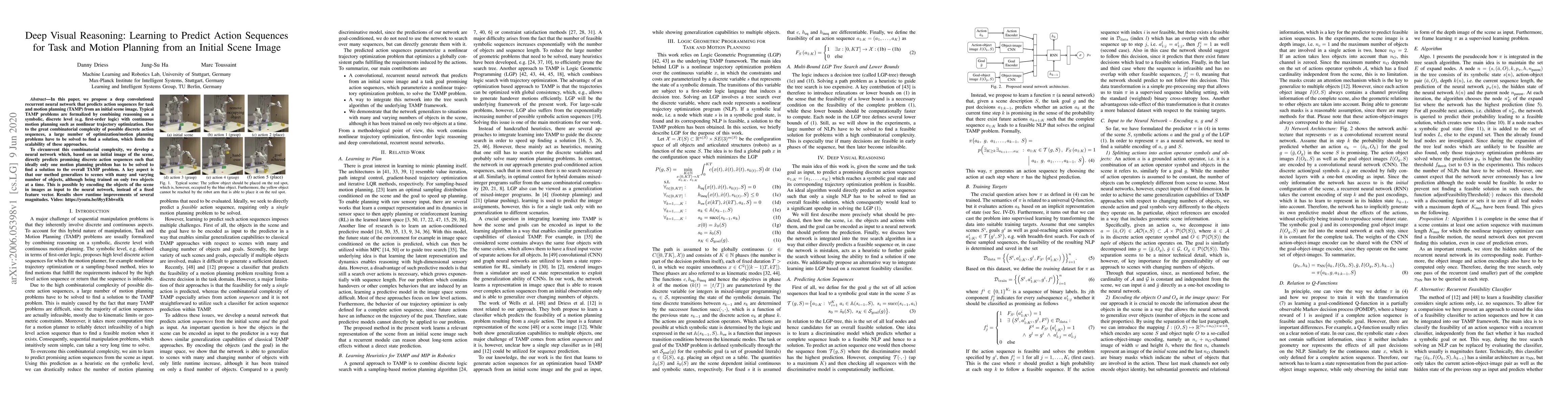 In this paper, we propose a deep convolutional recurrent neural network that predicts action sequences for task and motion planning (TAMP) from an initial scene image. Typical TAMP problems are formalized by combining reasoning on a symbolic, discrete level (e.g. first-order logic) with continuous motion planning such as nonlinear trajectory optimization. Due to the great combinatorial complexity of possible discrete action sequences, a large number of optimization/motion planning problems have to be solved to find a solution, which limits the scalability of these approaches. To circumvent this combinatorial complexity, we develop a neural network which, based on an initial image of the scene, directly predicts promising discrete action sequences such that ideally only one motion planning problem has to be solved to find a solution to the overall TAMP problem. A key aspect is that our method generalizes to scenes with many and varying number of objects, although being trained on only two objects at a time. This is possible by encoding the objects of the scene in images as input to the neural network, instead of a fixed feature vector. Results show runtime improvements of several magnitudes. Video: https://youtu.be/i8yyEbbvoEk