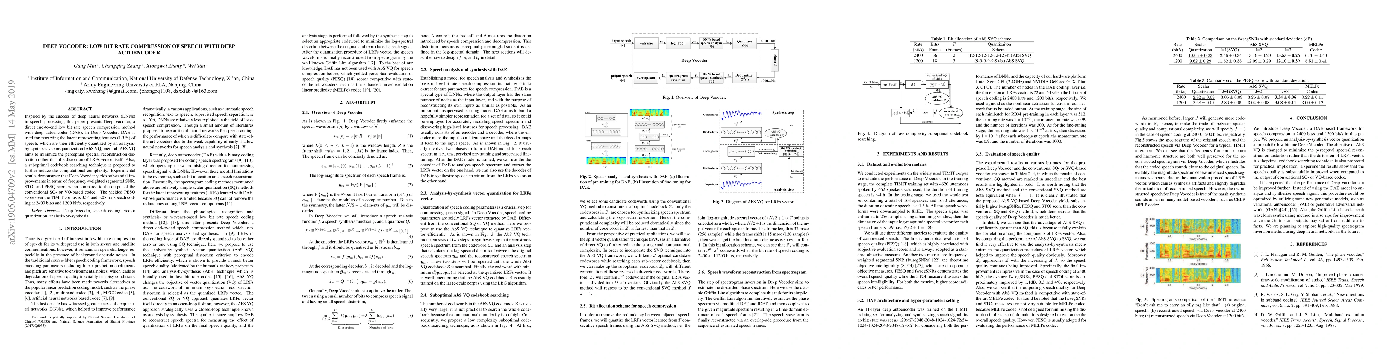 This paper introduces Deep Vocoder, an end-to-end low bit rate speech compression method using deep autoencoders to extract latent features, which are then quantized by an analysis-by-synthesis vector quantization method to minimize perceptual distortion. Experimental results show significant improvements in frequency-weighted segmental SNR, STOI, and PESQ scores compared to conventional codecs.