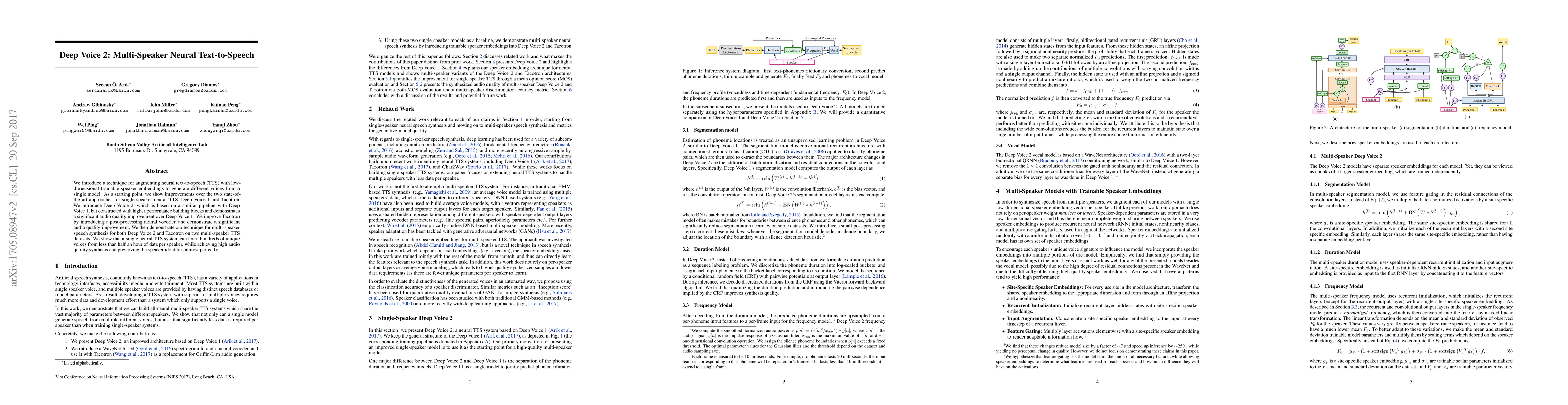 Deep Voice 2 introduces a neural text-to-speech technique with trainable speaker embeddings for multi-speaker voice generation, significantly improving audio quality over Deep Voice 1 and Tacotron. The method enables a single model to synthesize hundreds of unique voices from minimal training data while maintaining high audio quality and speaker identity.