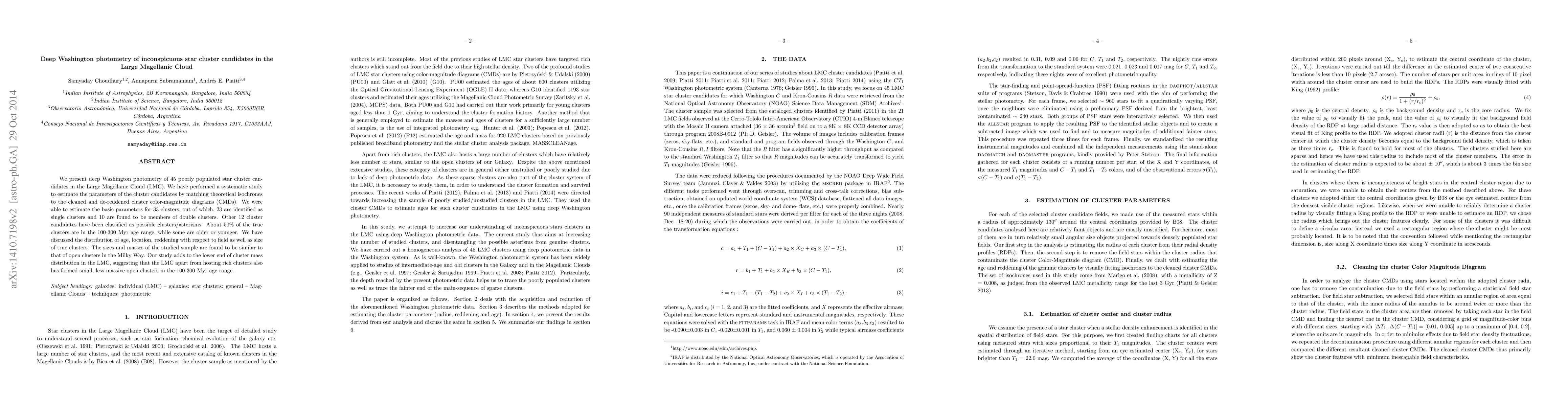 This paper presents deep Washington photometry of 45 star cluster candidates in the Large Magellanic Cloud, identifying 33 as true clusters, with 23 as single and 10 as double clusters. The study finds that about 50% of these clusters are in the 100-300 Myr age range, contributing to the understanding of the LMC's lower end of cluster mass distribution.