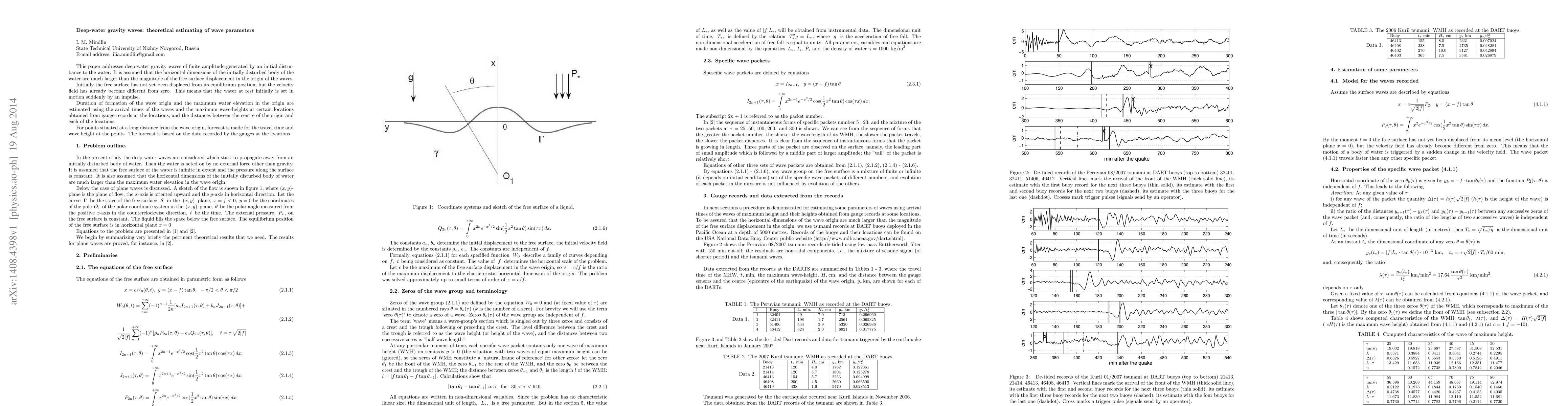 This paper estimates parameters of deep-water gravity waves of finite amplitude generated by an initial disturbance, using gauge records to determine wave formation duration, maximum wave height, and travel time at distant points. Theoretical models predict wave characteristics based on initial conditions and observed wave data.