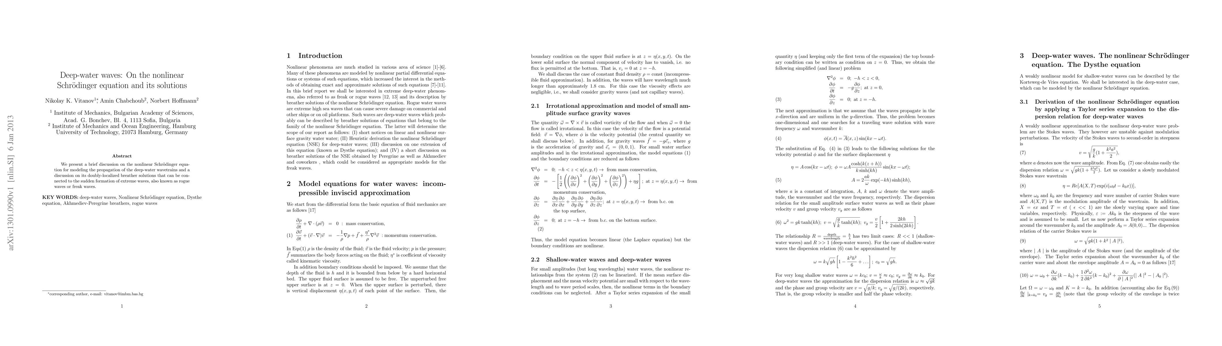 Summary: This paper explores the nonlinear Schrödinger equation for modeling deep-water wavetrains and discusses doubly-localized breather solutions associated with the emergence of rogue waves.