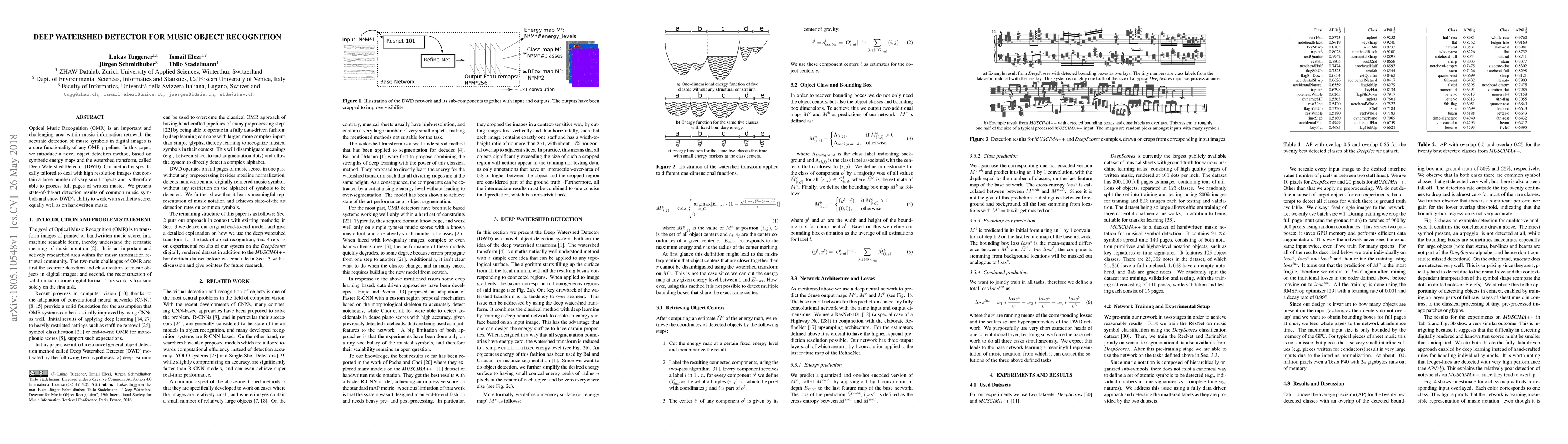 Optical Music Recognition (OMR) is an important and challenging area within music information retrieval, the accurate detection of music symbols in digital images is a core functionality of any OMR pipeline. In this paper, we introduce a novel object detection method, based on synthetic energy maps and the watershed transform, called Deep Watershed Detector (DWD). Our method is specifically tailored to deal with high resolution images that contain a large number of very small objects and is therefore able to process full pages of written music. We present state-of-the-art detection results of common music symbols and show DWD's ability to work with synthetic scores equally well as on handwritten music.