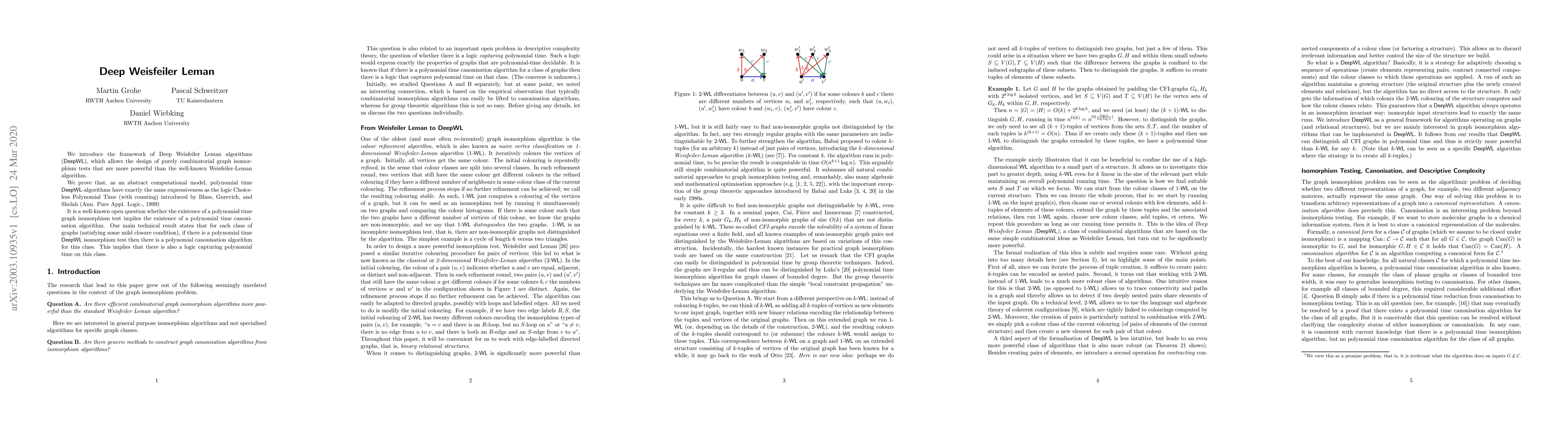 The Deep Weisfeiler Leman (DeepWL) framework offers a powerful combinatorial graph isomorphism test surpassing the traditional Weisfeiler-Leman algorithm. It is shown that polynomial time DeepWL algorithms are equivalent in expressiveness to the Choiceless Polynomial Time logic, and it is proven that a polynomial time DeepWL isomorphism test implies the existence of a polynomial time canonisation algorithm for specific graph classes.