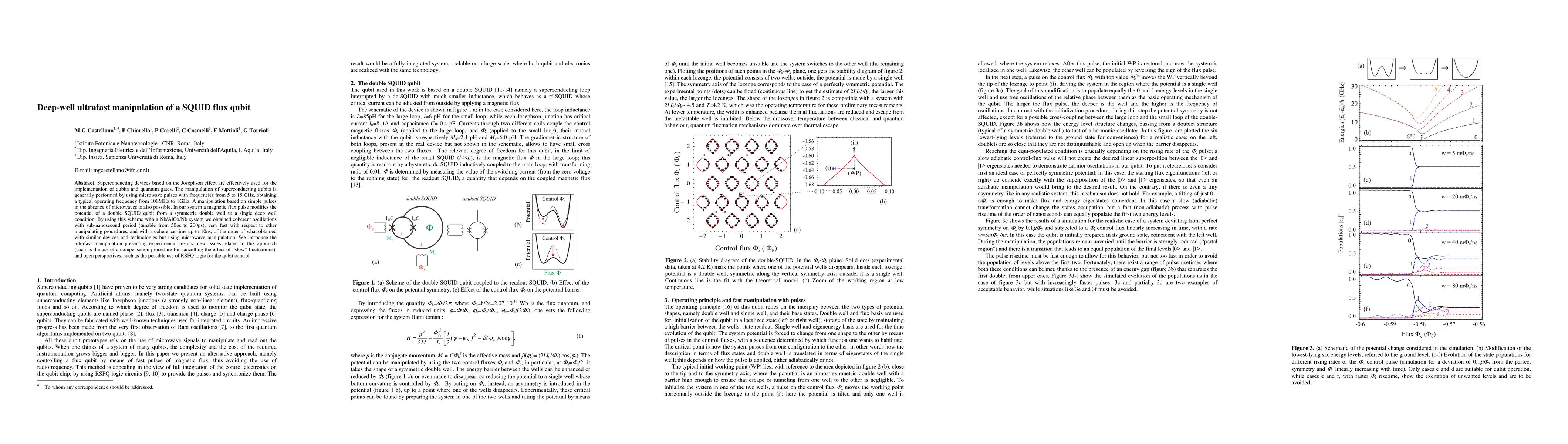 Superconducting devices based on the Josephson effect are effectively used for the implementation of qubits and quantum gates. The manipulation of superconducting qubits is generally performed by using microwave pulses with frequencies from 5 to 15 GHz, obtaining a typical operating clock from 100MHz to 1GHz. A manipulation based on simple pulses in the absence of microwaves is also possible. In our system a magnetic flux pulse modifies the potential of a double SQUID qubit from a symmetric double well to a single deep well condition. By using this scheme with a Nb/AlOx/Nb system we obtained coherent oscillations with sub-nanosecond period (tunable from 50ps to 200ps), very fast with respect to other manipulating procedures, and with a coherence time up to 10ns, of the order of what obtained with similar devices and technologies but using microwave manipulation. We introduce the ultrafast manipulation presenting experimental results, new issues related to this approach (such as the use of a feedback procedure for cancelling the effect of "slow" fluctuations), and open perspectives, such as the possible use of RSFQ logic for the qubit control.