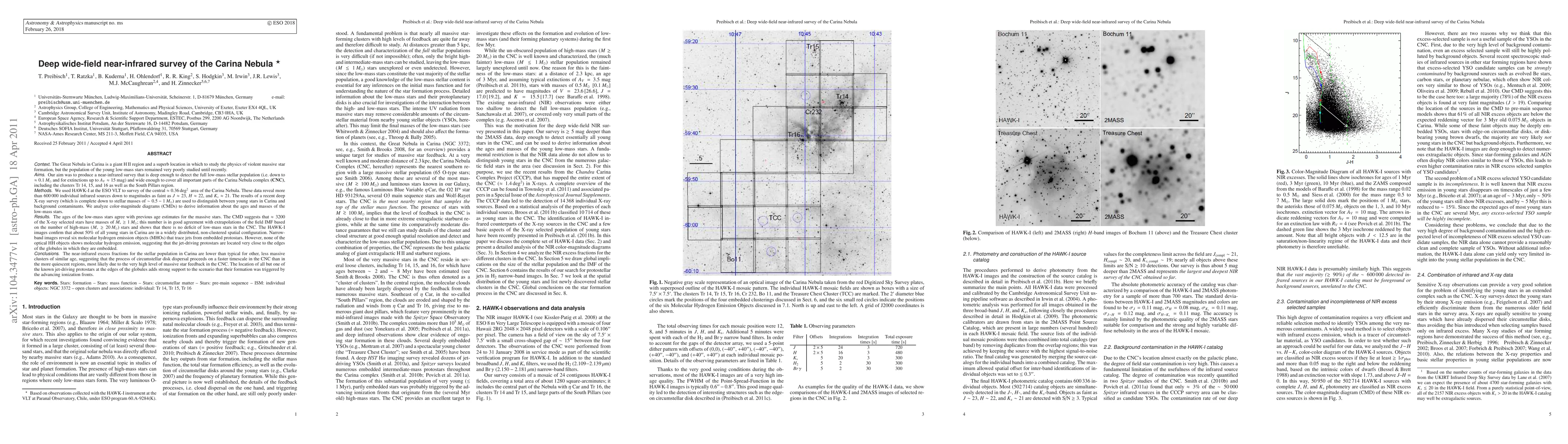 (abbreviated) We used HAWK-I at the ESO VLT to produce a near-infrared survey of the Carina Nebula that is deep enough to detect the full low-mass stellar population. The results of a recent deep X-ray survey are used to distinguish between young stars in Carina and background contaminants. We find that the ages of the low-mass stars (derived from color-magnitude diagrams of the invidual cluster in the Carina Nebula) agree with previous age estimates for the massive stars. About 3200 of the X-ray selected stars have masses >= 1 Msun; this number is in good agreement with extrapolations of the field IMF based on the number of high-mass stars and shows that there is no deficit of low-mass stars. The near-infrared excess fractions for the stellar populations in Carina are lower than typical for other, less massive clusters of similar age, suggesting a faster timescale of circumstellar disk dispersal than in the more quiescent regions, most likely due to the very high level of massive star feedback. Narrow-band images reveal six molecular hydrogen jets. However, none of the optical HH objects shows molecular hydrogen emission, suggesting that the jet-driving protostars are located very close to the edges of the globules in which they are embedded. This adds strong support to the scenario that their formation was triggered by the advancing ionization fronts.