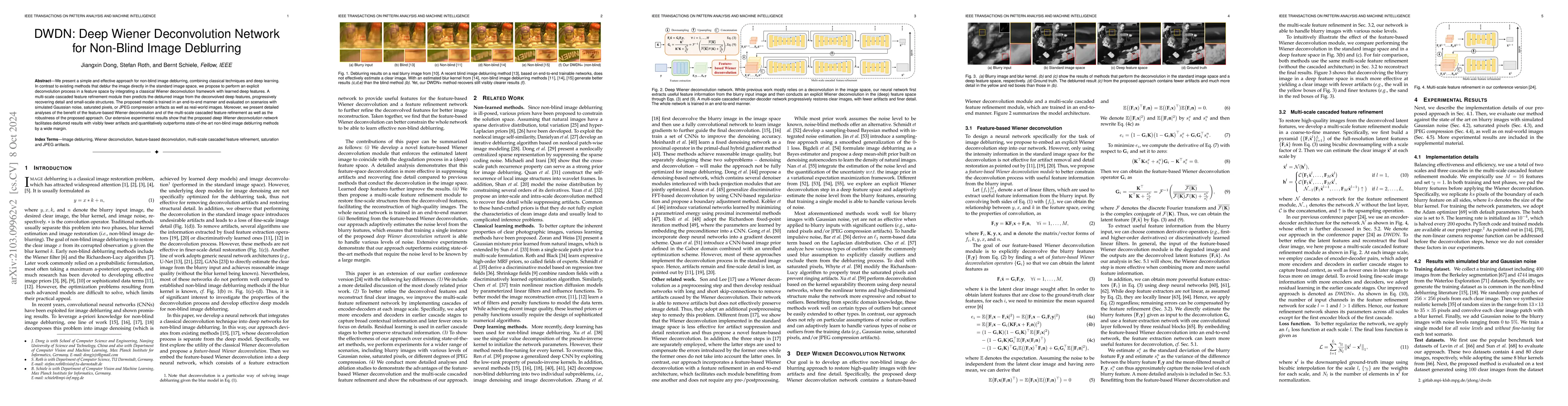 This paper proposes a deep Wiener deconvolution method that combines classical Wiener deconvolution with deep learning to perform non-blind image deblurring. The method deconvolves images in a feature space using learned deep features, followed by multi-scale feature refinement, leading to deblurred images with fewer artifacts and outperforming existing methods.