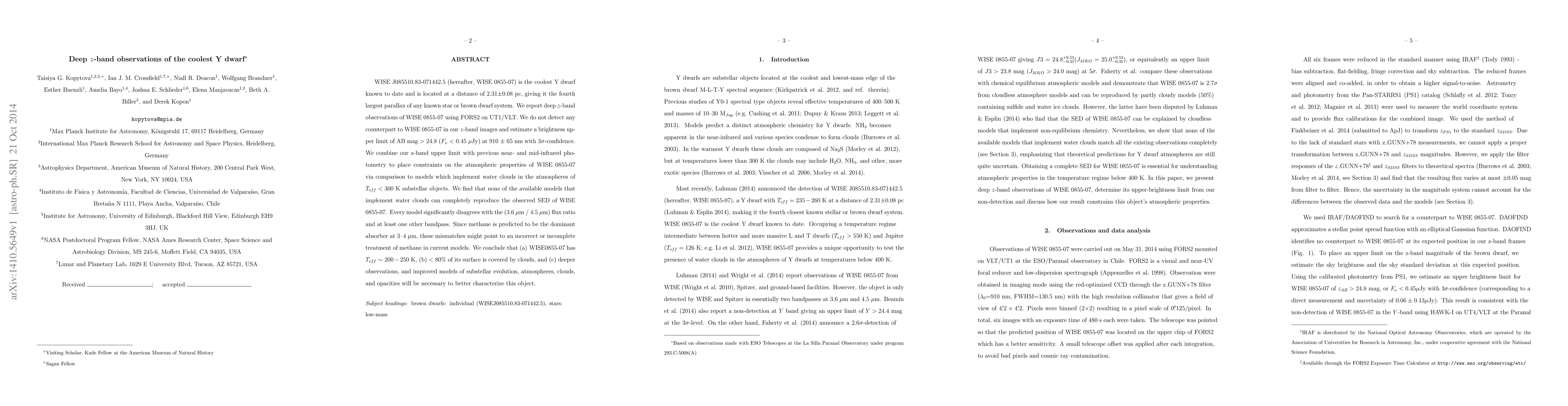WISE J085510.83-071442.5 (hereafter, WISE 0855-07) is the coolest Y dwarf known to date and is located at a distance of 2.31$\pm 0.08$ pc, giving it the fourth largest parallax of any known star or brown dwarf system. We report deep $z$-band observations of WISE 0855-07 using FORS2 on UT1/VLT. We do not detect any counterpart to WISE 0855-07 in our $z$-band images and estimate a brightness upper limit of AB mag $>$ 24.8 ($F_{\nu}$ $<$ 0.45 $\mu$Jy) at 910 $\pm$ 65 nm with $3\sigma$-confidence. We combine our z-band upper limit with previous near- and mid-infrared photometry to place constraints on the atmospheric properties of WISE 0855-07 via comparison to models which implement water clouds in the atmospheres of $T_{eff} < 300$ K substellar objects. We find that none of the available models that implement water clouds can completely reproduce the observed SED of WISE 0855-07. Every model significantly disagrees with the (3.6 $\mu$m / 4.5 $\mu$m) flux ratio and at least one other bandpass. Since methane is predicted to be the dominant absorber at 3-4 $\mu$m, these mismatches might point to an incorrect or incomplete treatment of methane in current models. We conclude that \mbox{(a) WISE0855-07} has $T_{eff} \sim 200-250$~K, (b) $< 80 \%$ of its surface is covered by clouds, and (c) deeper observations, and improved models of substellar evolution, atmospheres, clouds, and opacities will be necessary to better characterize this object.