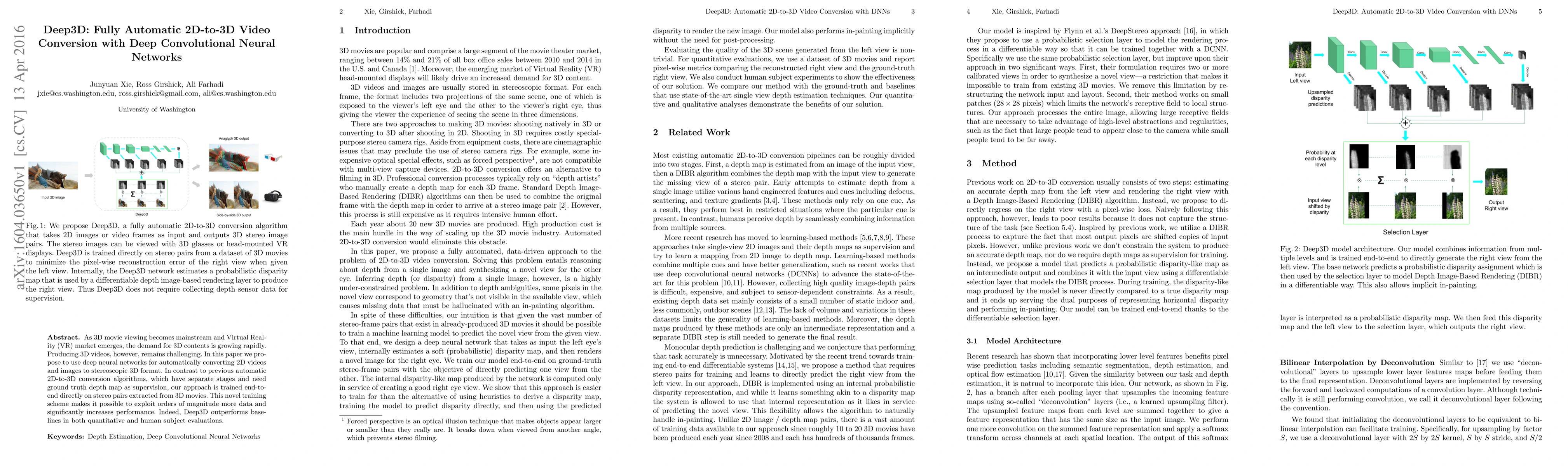 Deep3D leverages deep convolutional neural networks for fully automatic 2D-to-3D video conversion, trained end-to-end on stereoscopic pairs from 3D movies, significantly improving performance over previous methods. The approach outperforms baselines in both quantitative metrics and human evaluations.