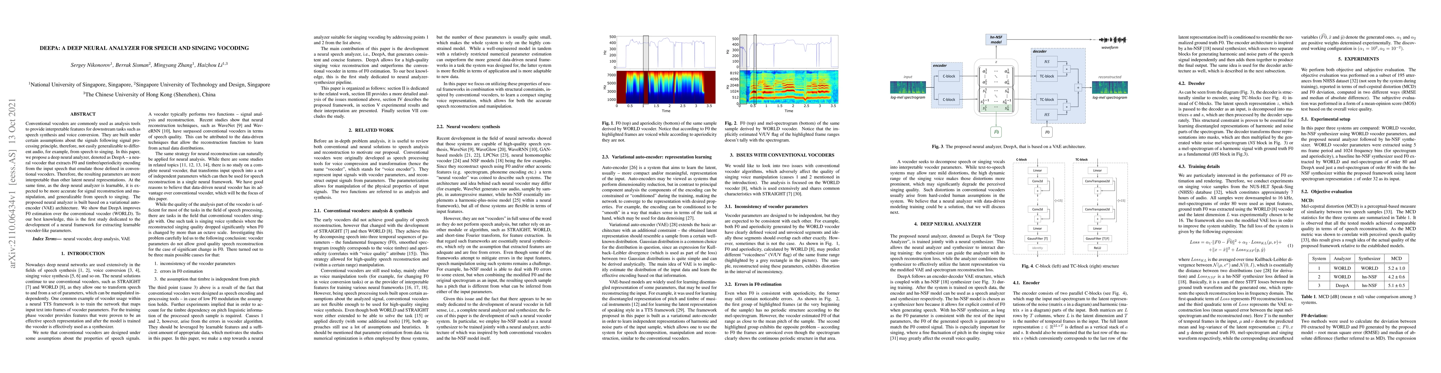 This paper introduces DeepA, a deep neural analyzer for speech and singing vocoding that extracts F0 and timbre encoding, offering more interpretable parameters than other neural representations. Built on a variational autoencoder, DeepA aims to improve F0 estimation and signal reconstruction accuracy, demonstrating better generalization from speech to singing compared to conventional vocoders.